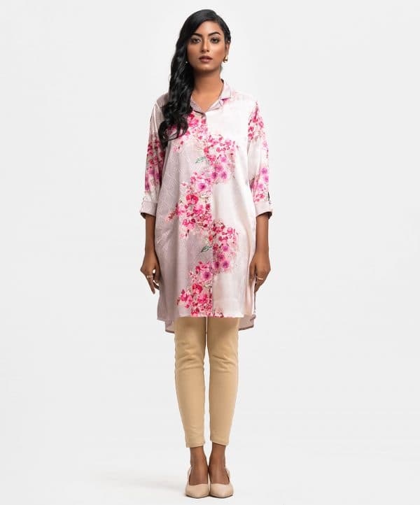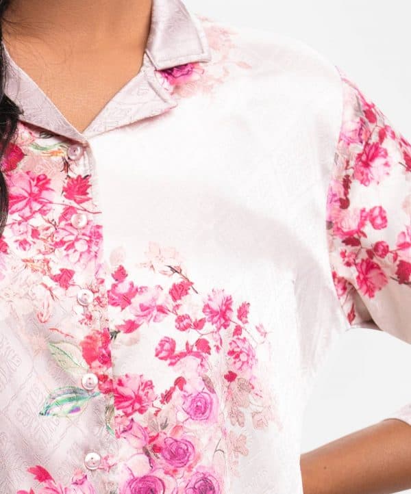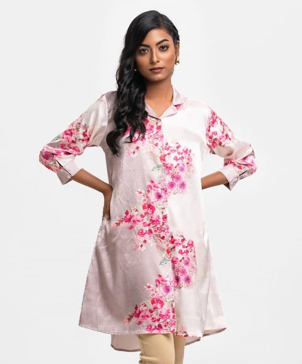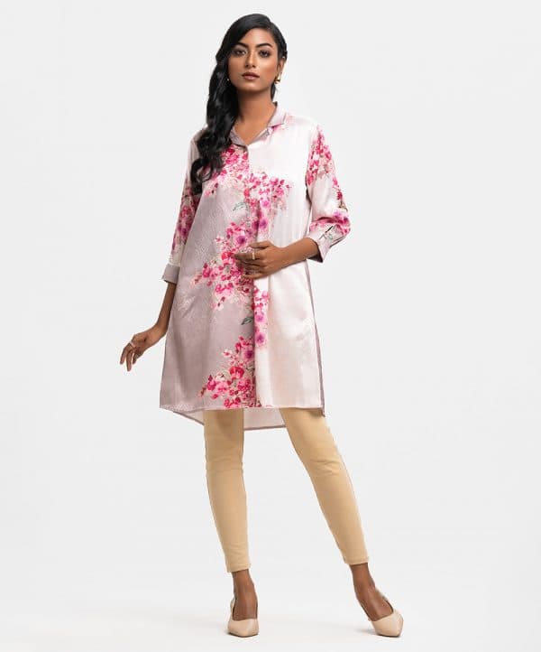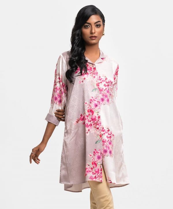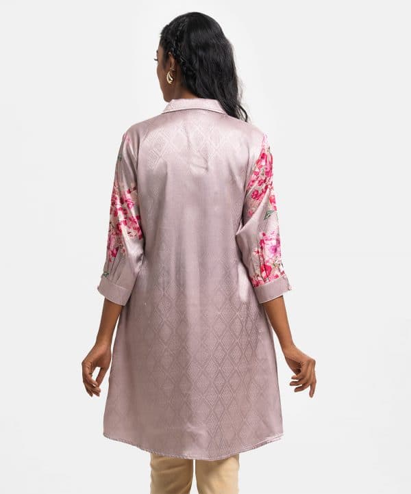 Ladies A-line shirt in printed jacquard fabric. Lapel collar, three-quarter button cuff sleeves. Front buttons opening and inseam pockets.