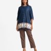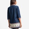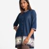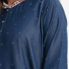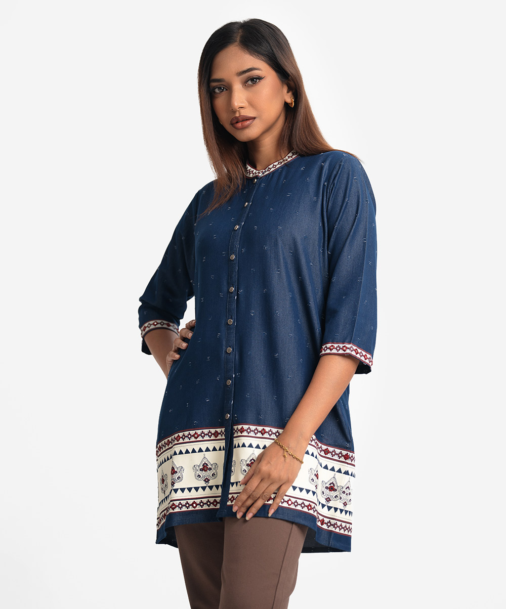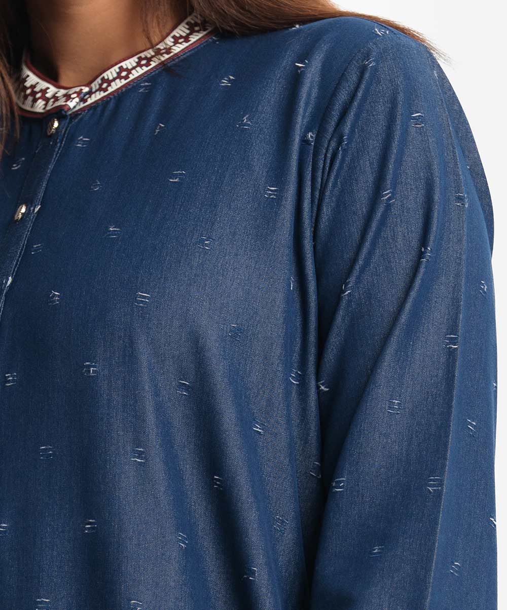 Band neck shirt in stretchable chambray fabric. Karchupi on the collar and cuffs. Inseam side pockets.