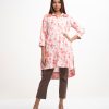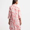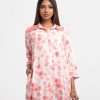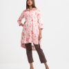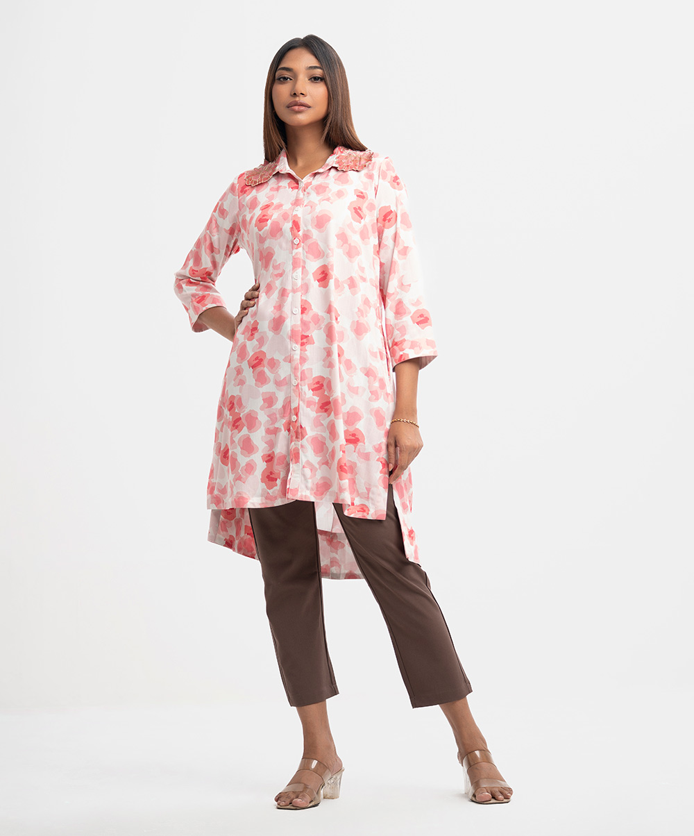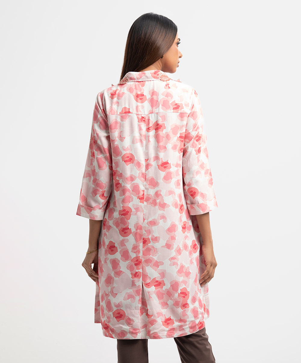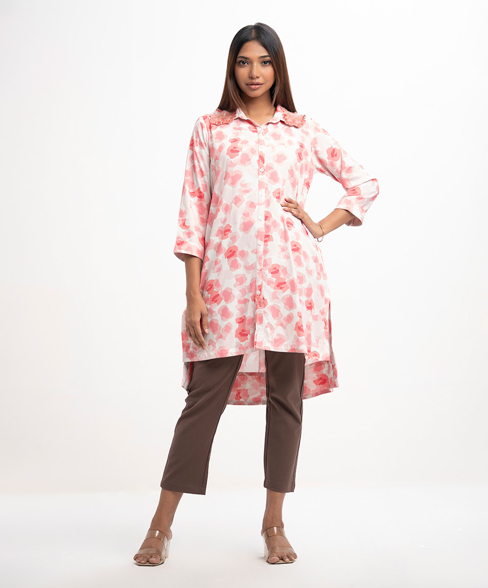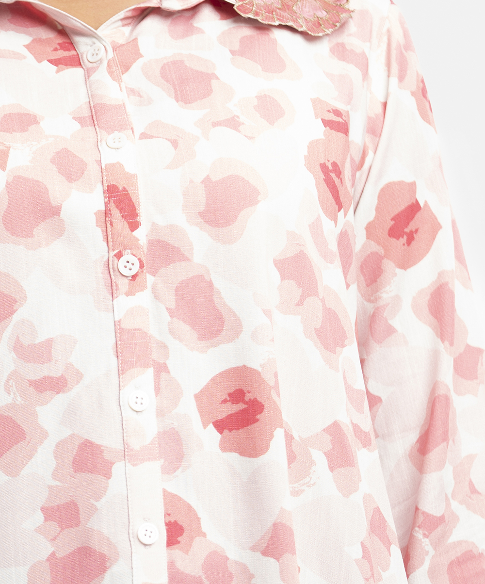 Floral cut-work collar shirt in rayon fabric. Three-quarter folded cuff sleeves, inseam side pockets.