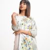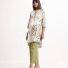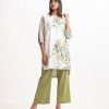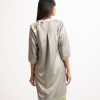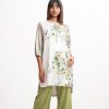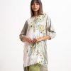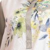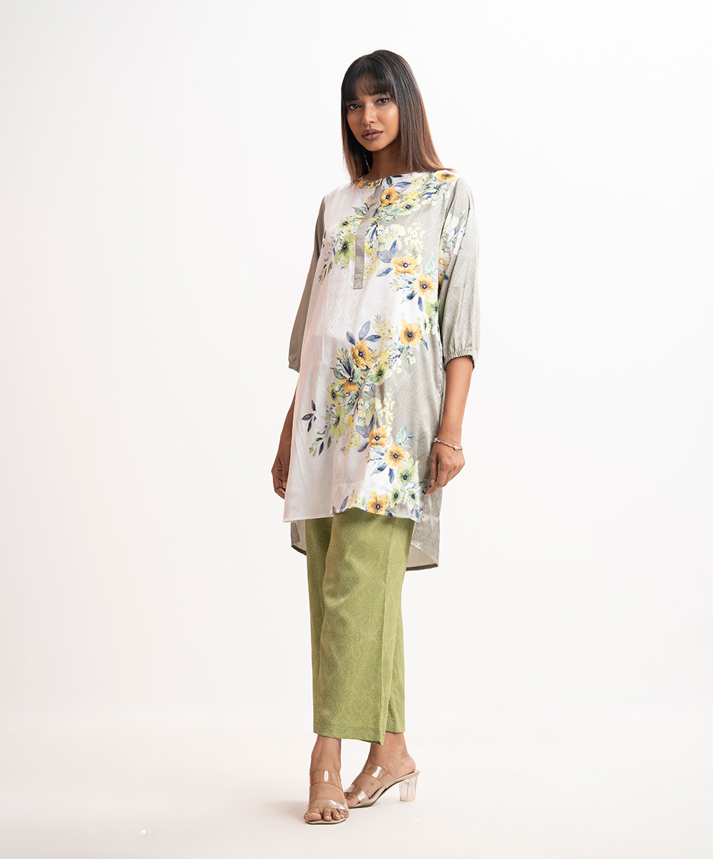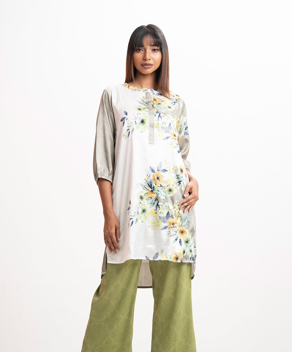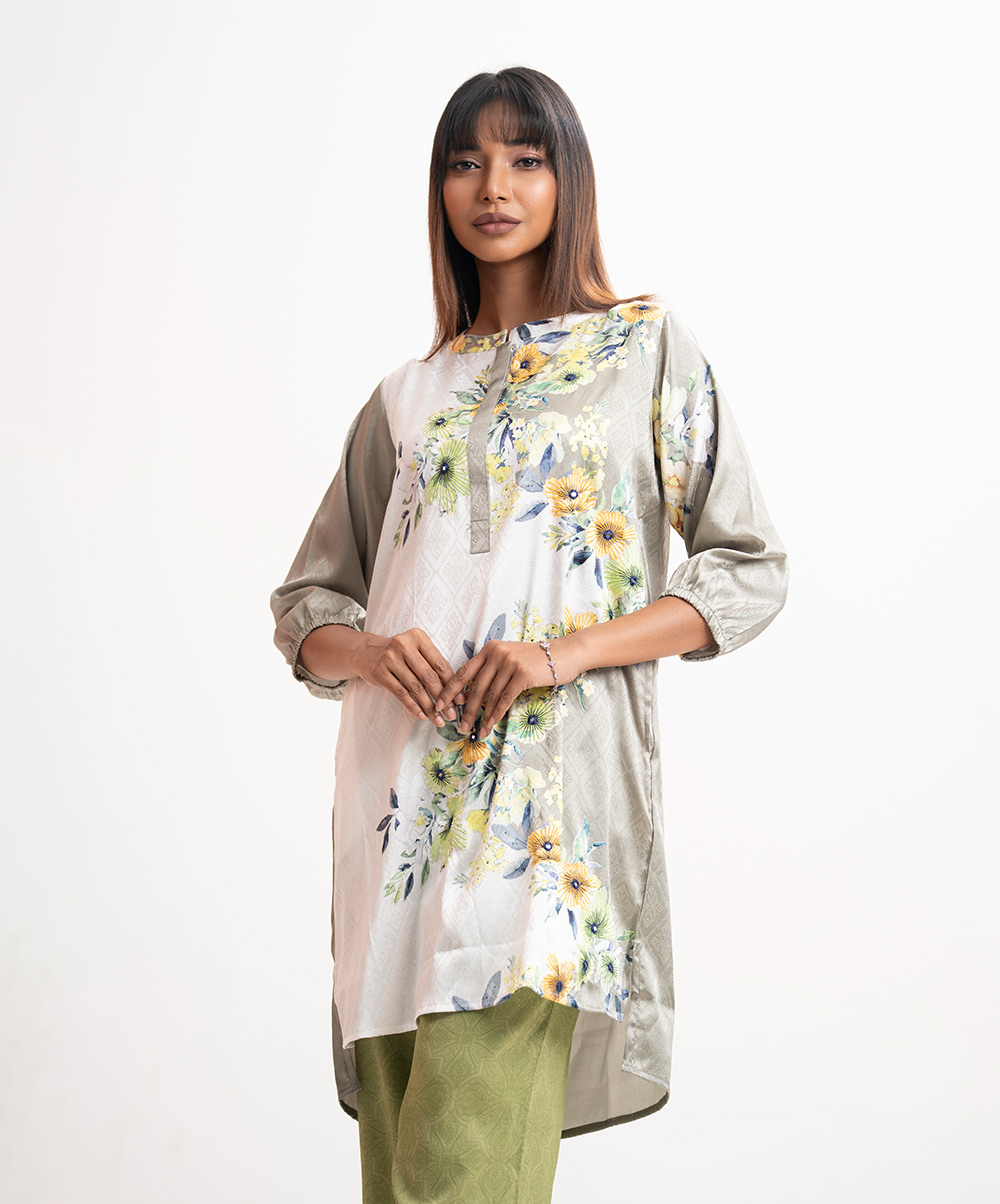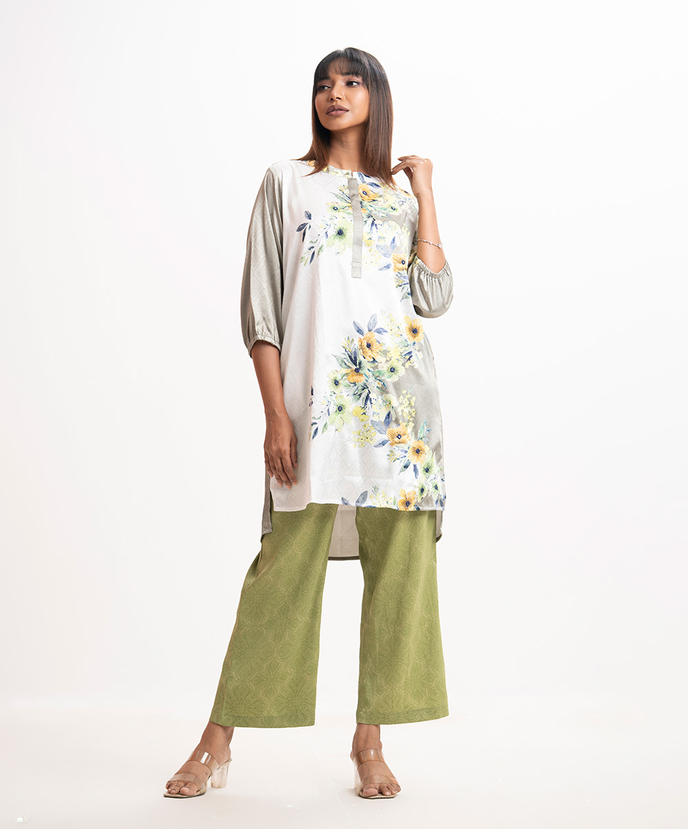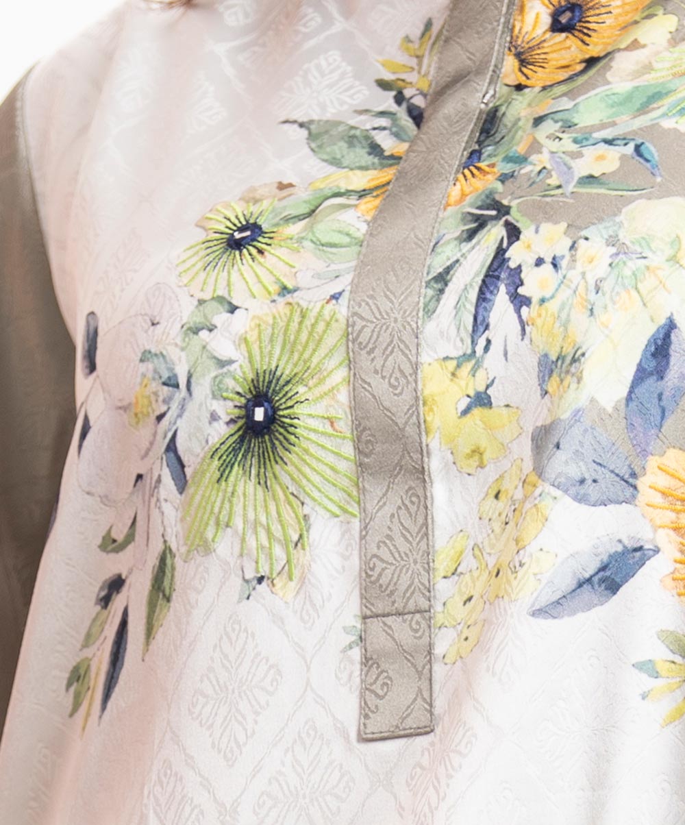 Band collar ladies shirt in jacquard georgette fabric. Three-quarter bishop sleeves with side pockets.