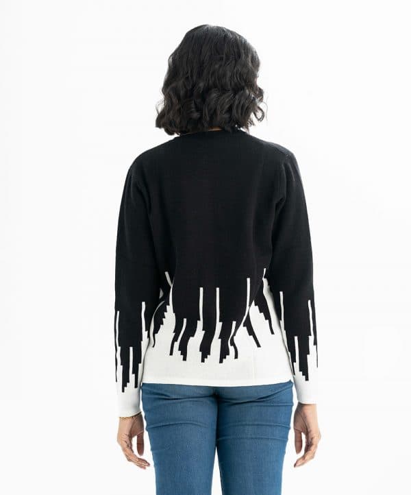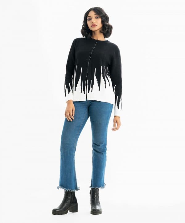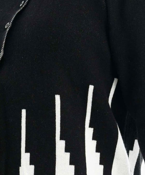 Women’s winter short pattern sweater in viscose knit fabric. Round neck, full sleeves and front buttons opening.