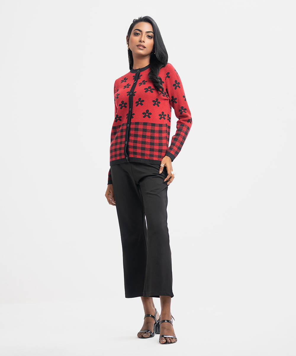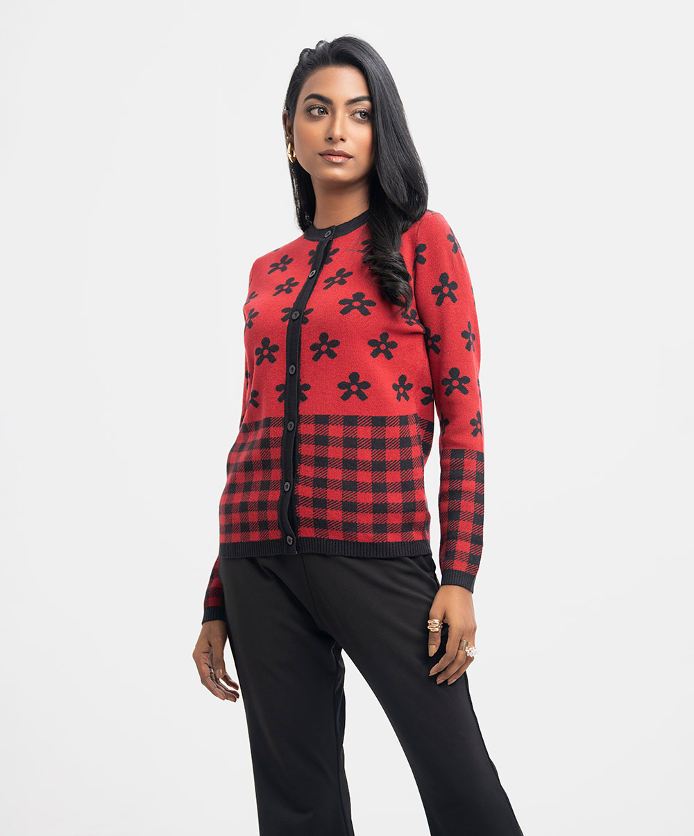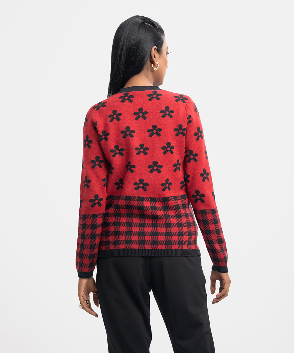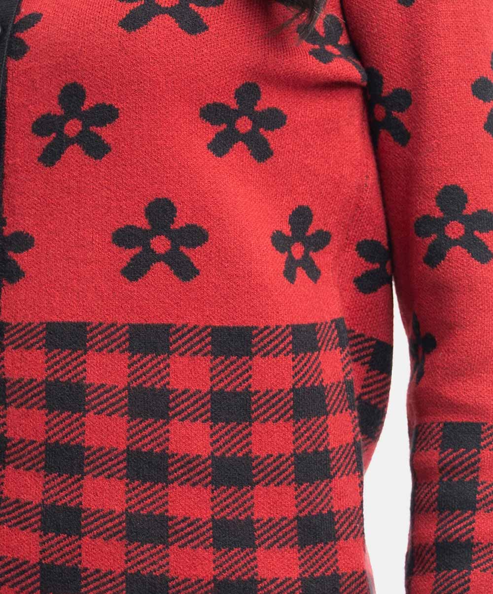 Women’s floral pattern winter woven detail sweater in viscose blended knit fabric. Round neck, full sleeves and front buttons opening.