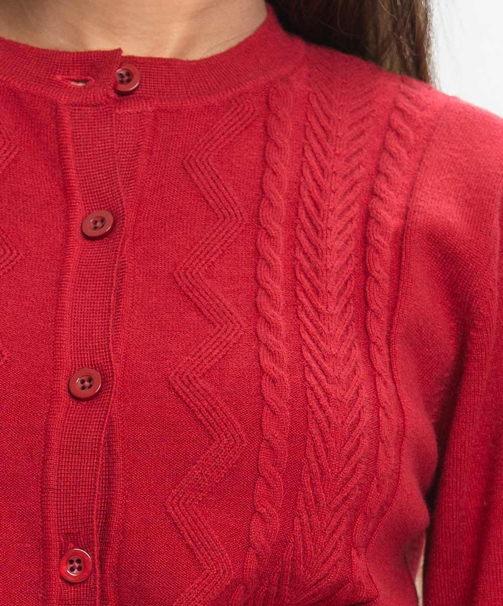 Women’s floral pattern winter woven detail cardigan sweater in viscose blended knit fabric. Round neck, full sleeves and front buttons opening.