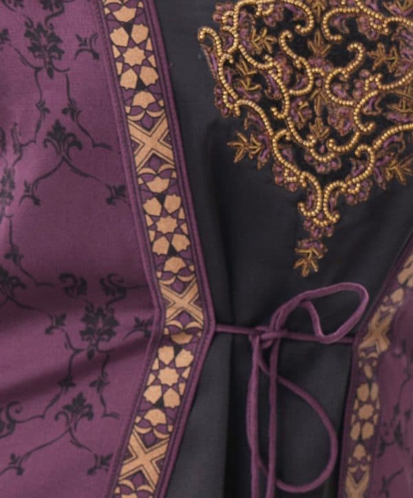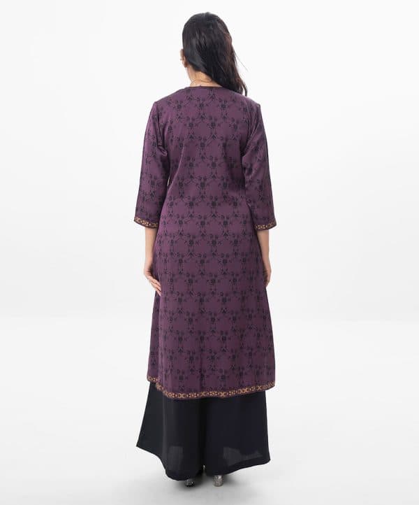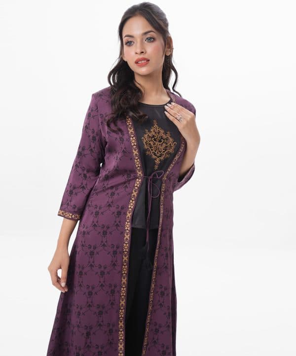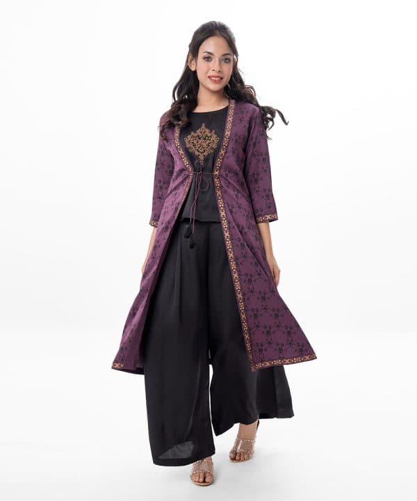 Top bottom set with round neck and quarter sleeve work with karcupi and screen print on crap silk fabric.