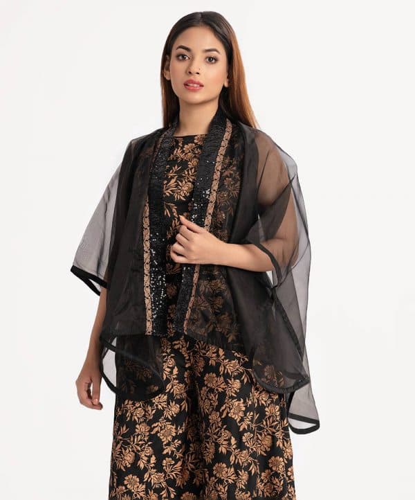 Women’s shrug style top-bottom set in organza fabric. Sleeveless karchupi detail top with karchupi assembled patch collar open front shrug. Printed palazzo pants as the bottom.