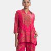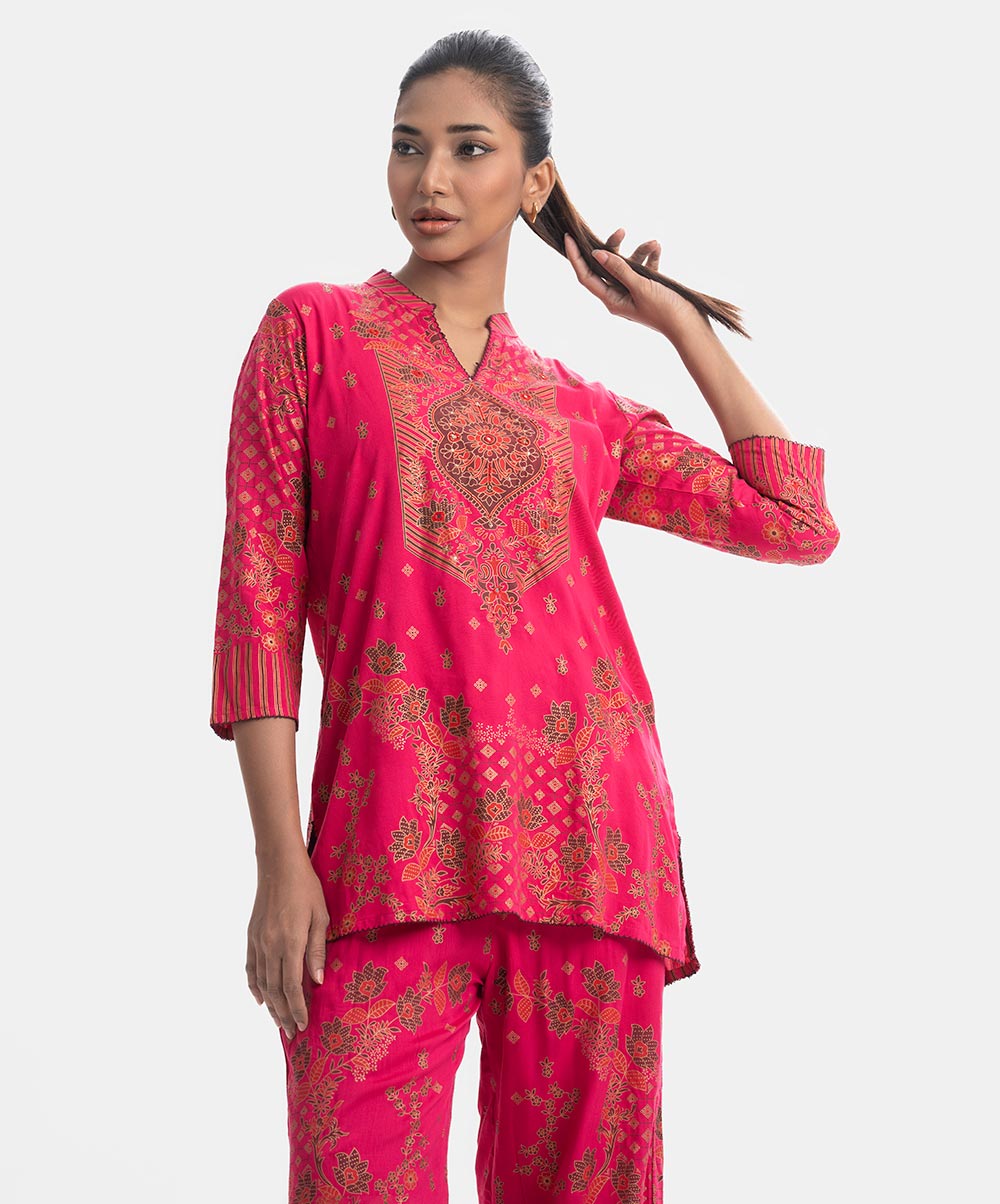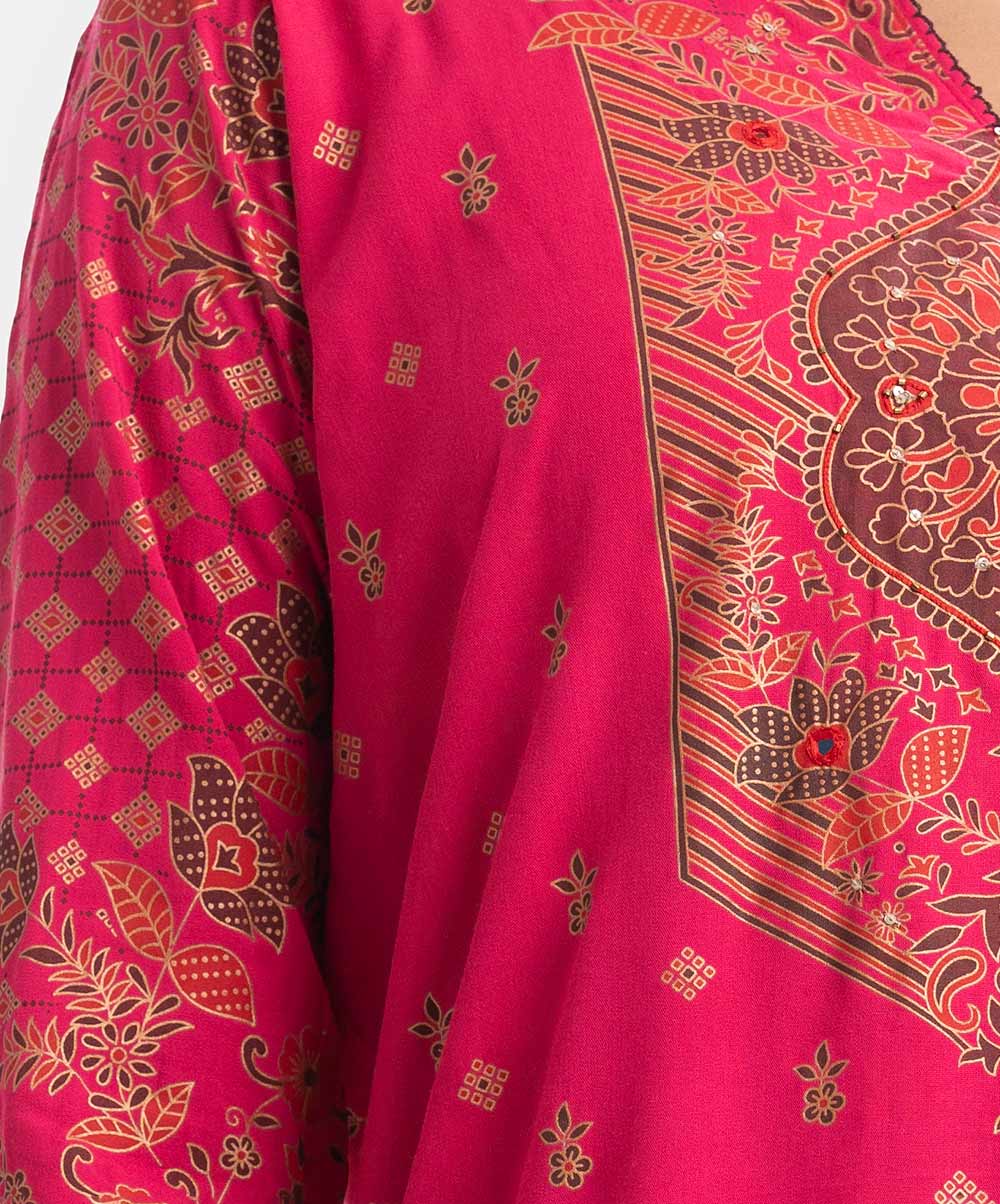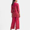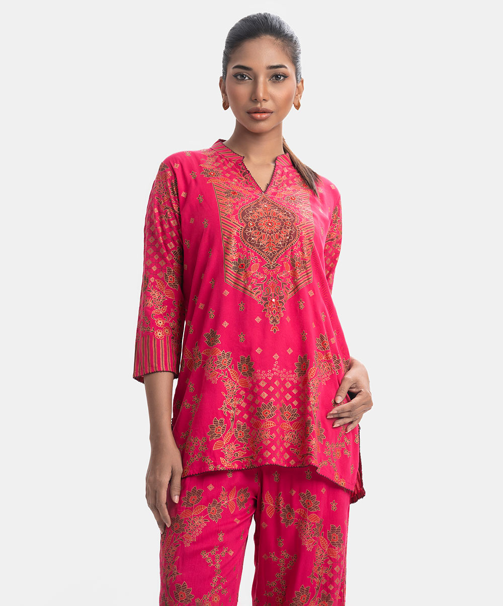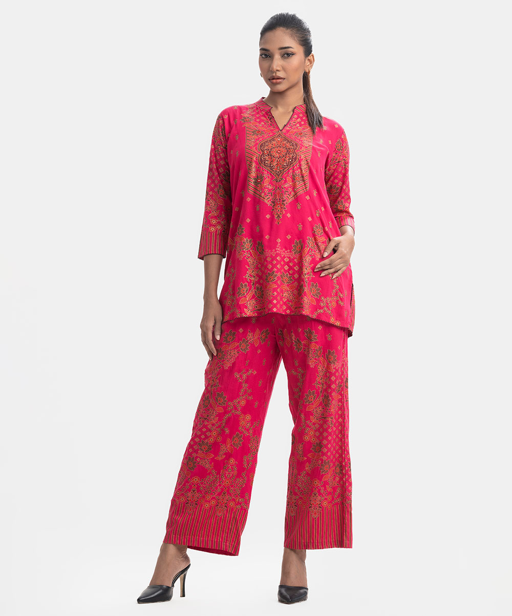 V-neck top and bottom set in viscose fabric. karchupi at the front. Comfort fit palazzo pant with side pockets.