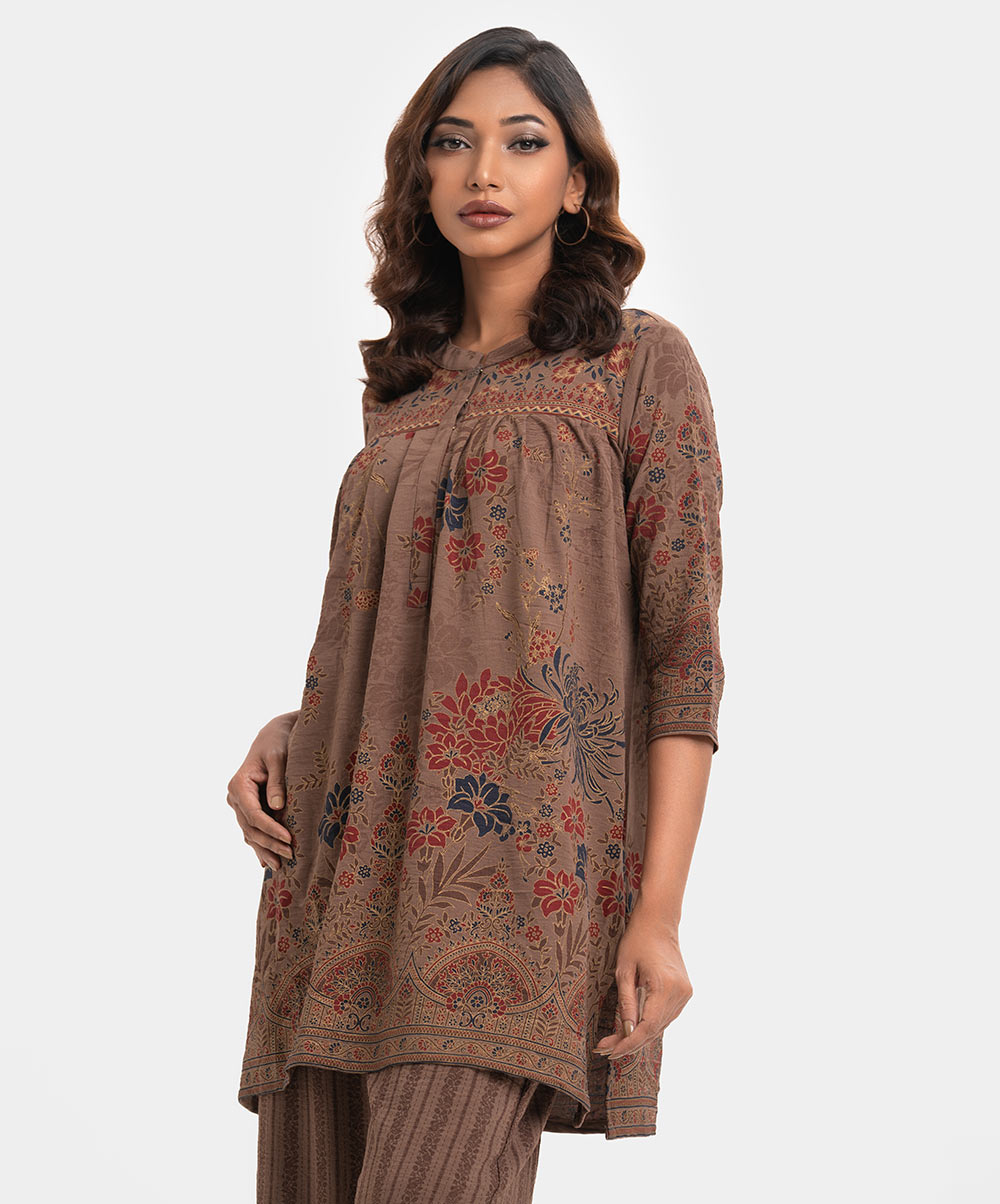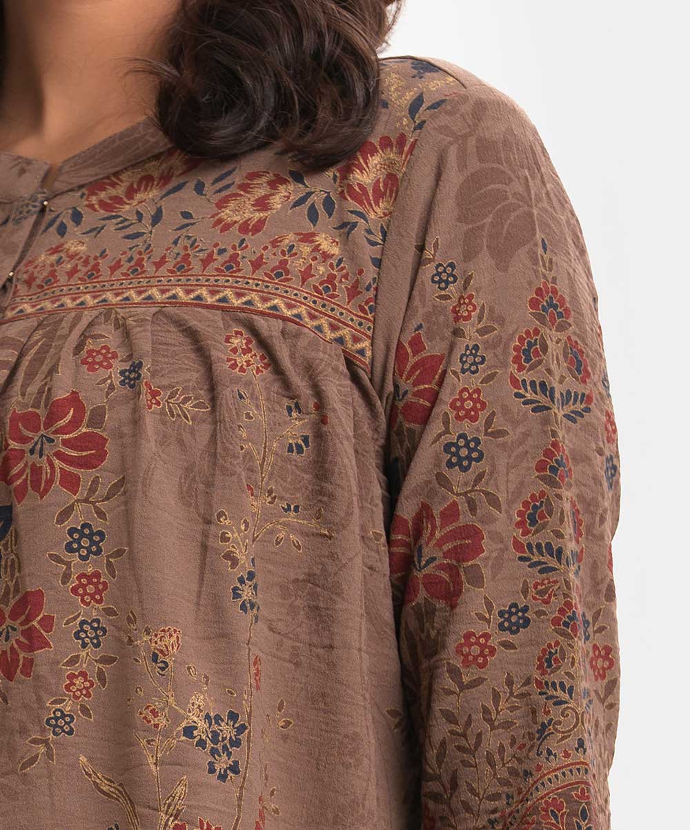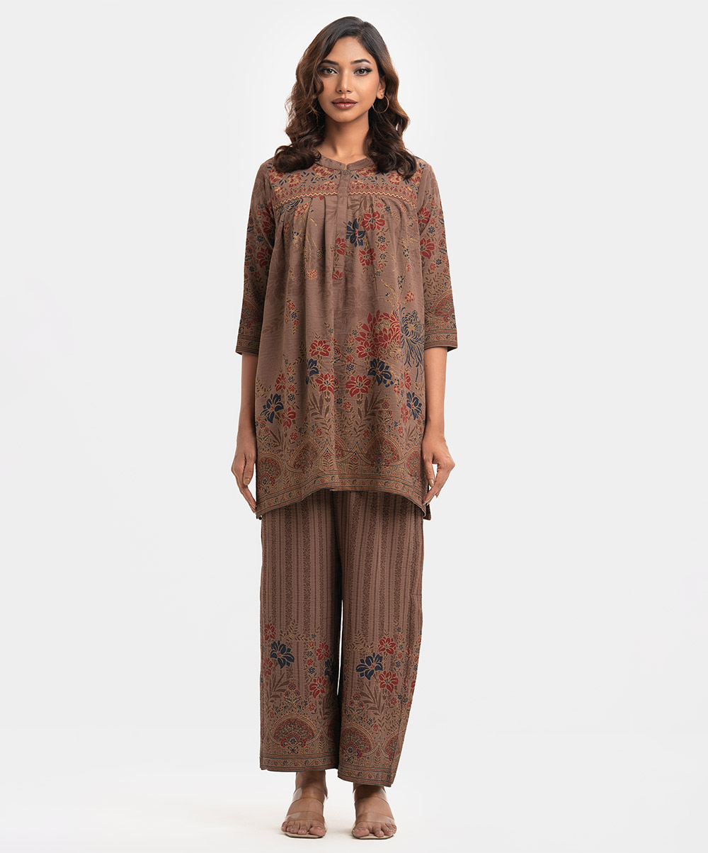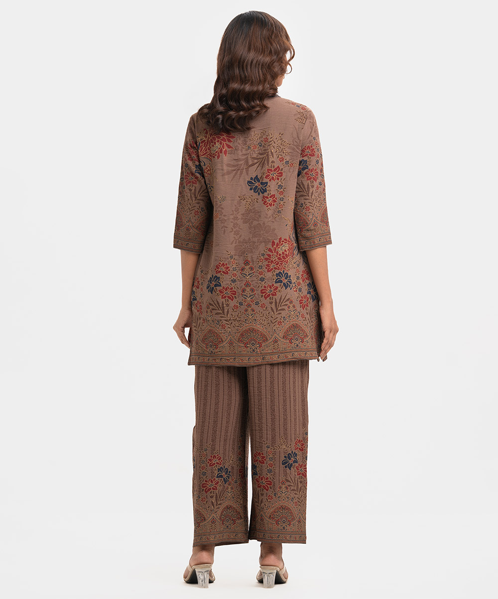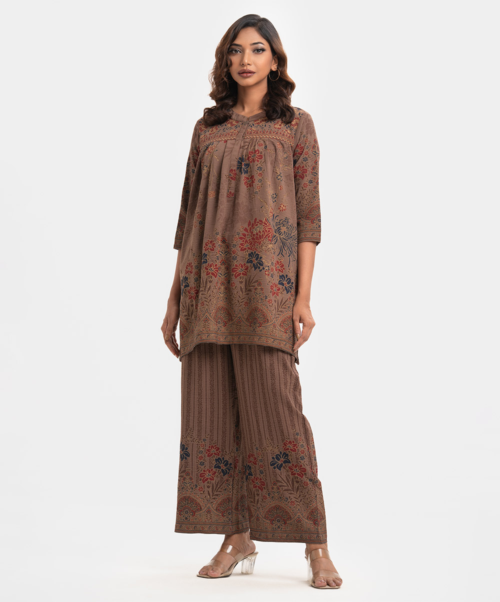 Women’s printed top-bottom set in georgette fabric. Stand collar, three-quarter sleeves, tent style top. Palazzo pants as the bottom.