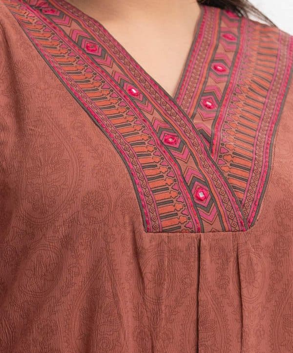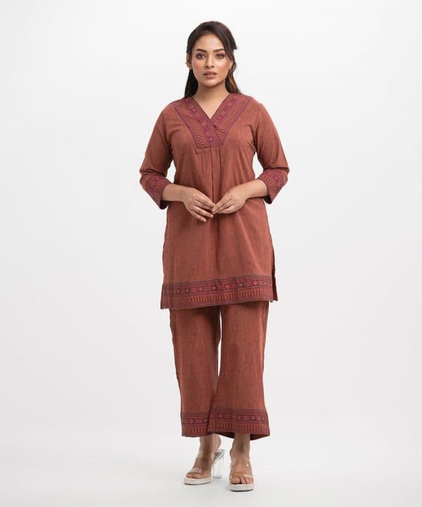 Women’s printed top bottom set in joom fabric. V-neck, bell sleeves, patch & karchupi detail tent style top. Palazzo pants as the bottom.