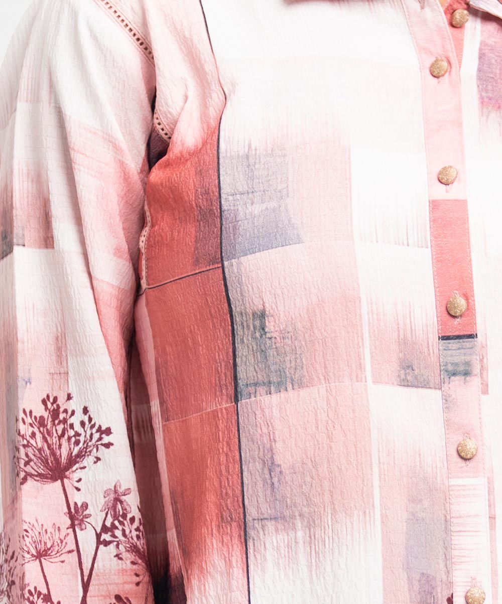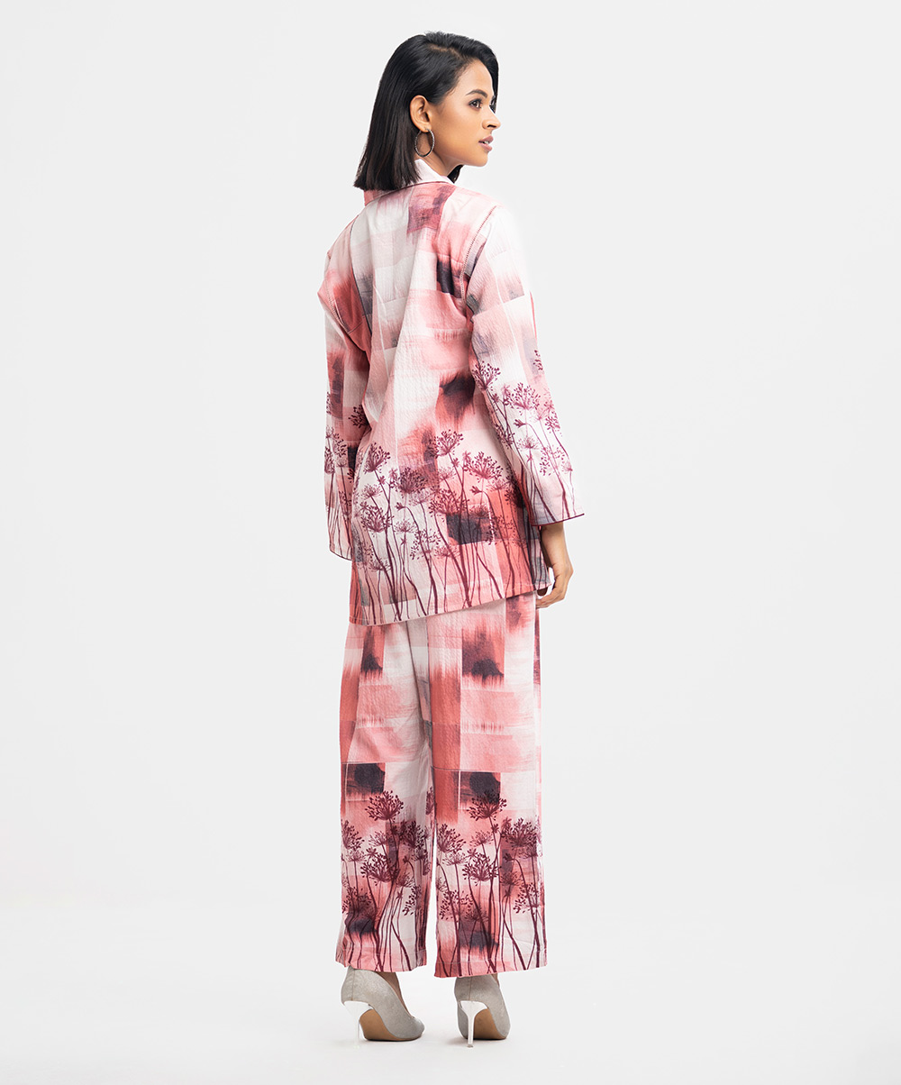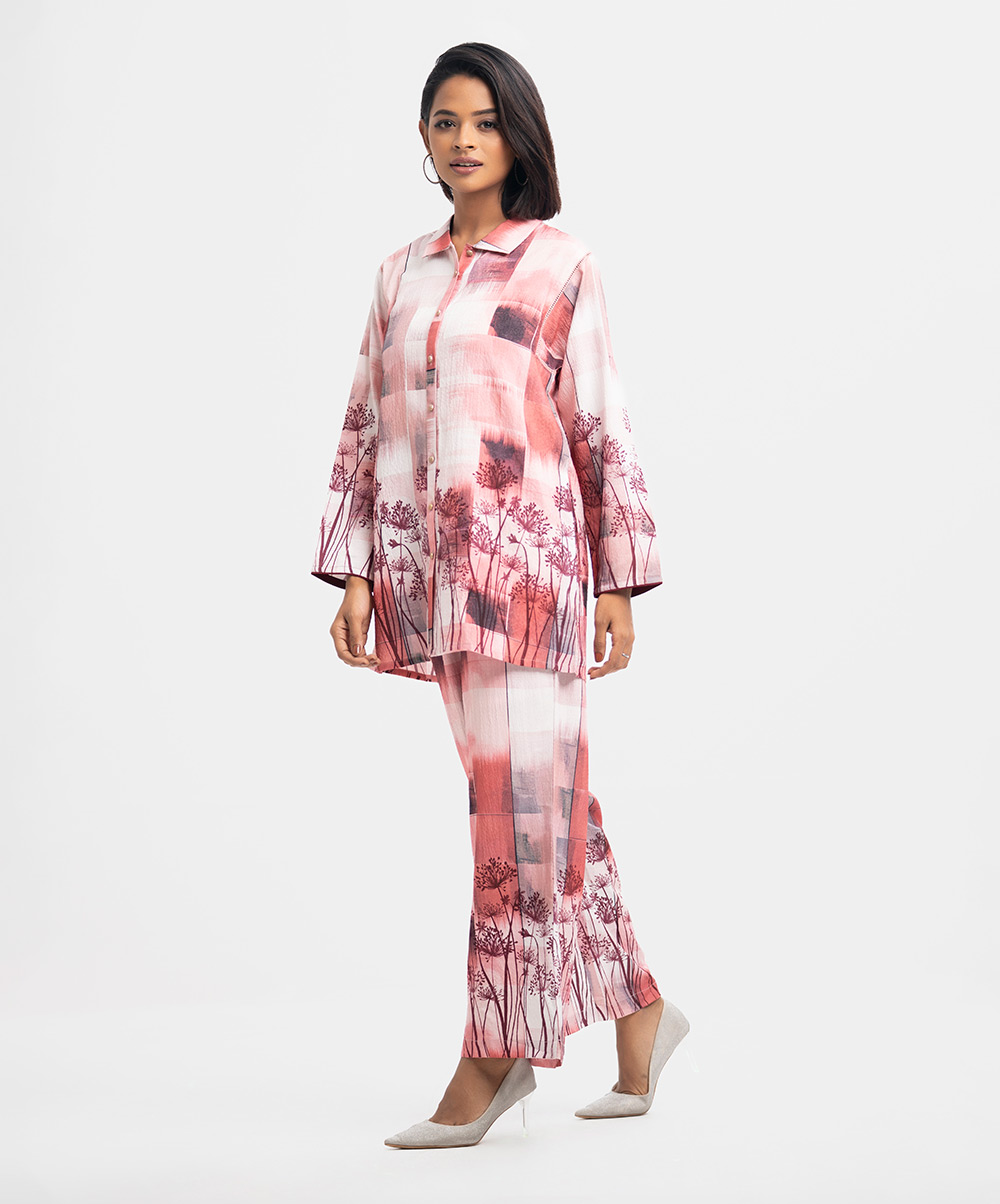 Shirt style top and bottom set in blended fabric. Full-sleeved, A-lined.