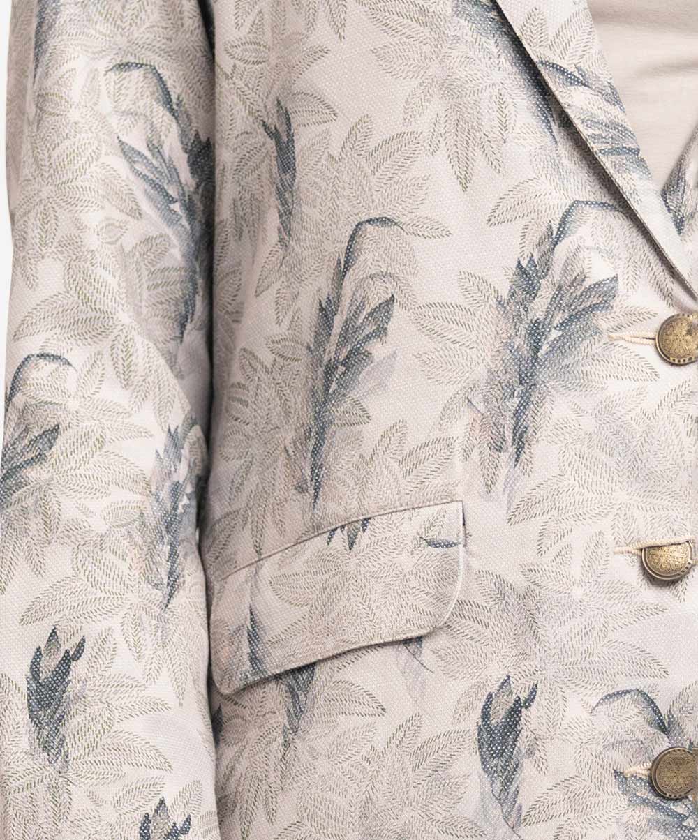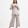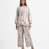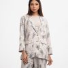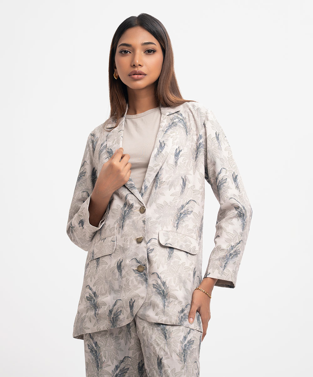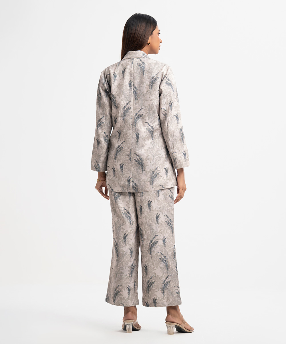 Women’s exclusive top bottom set in printed rayon blended fabric. Blazer cut top with single-breasted, lapel collar, full sleeves and flap pockets at front. Straight cut pants as the bottom.