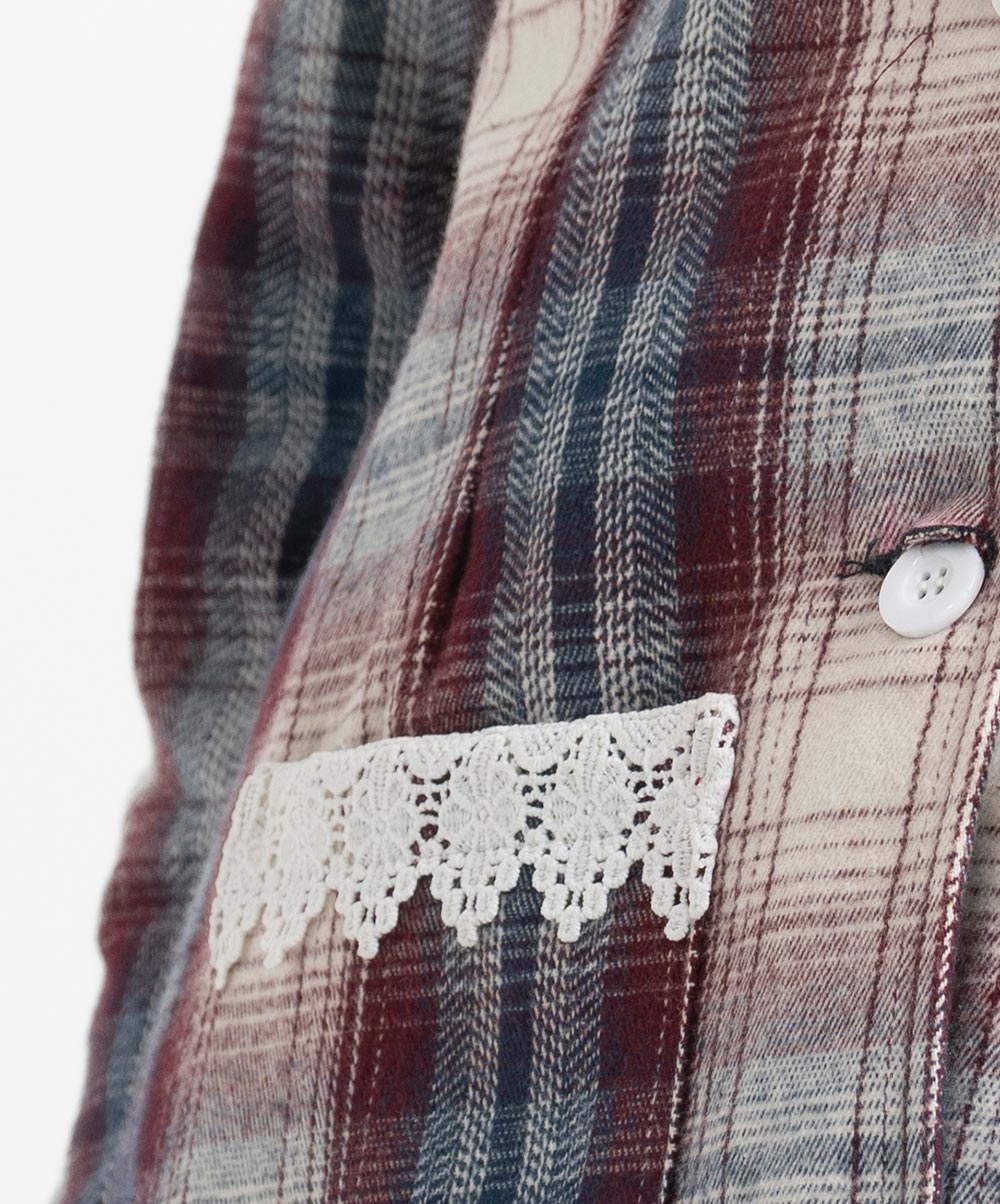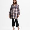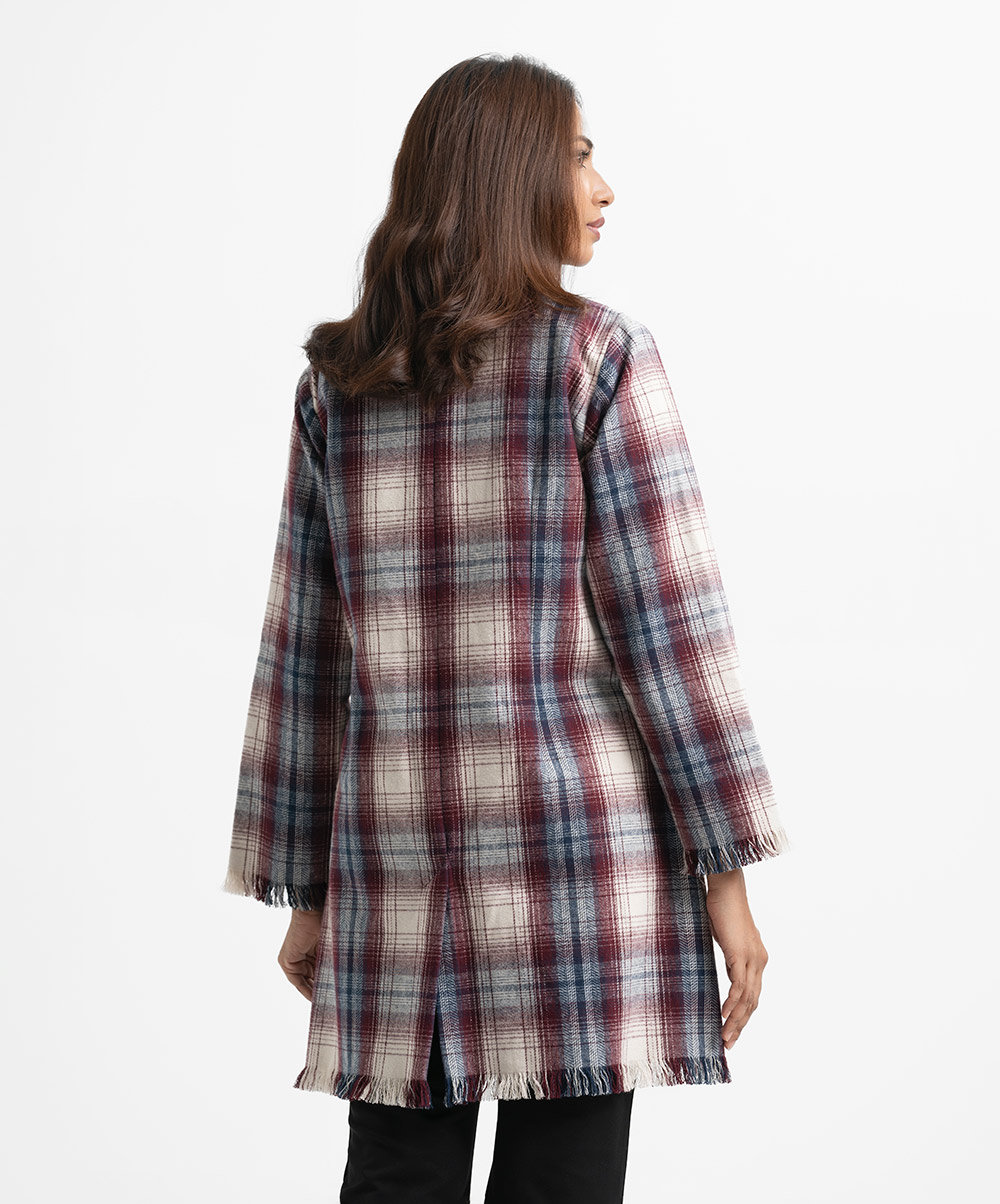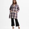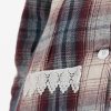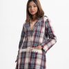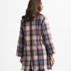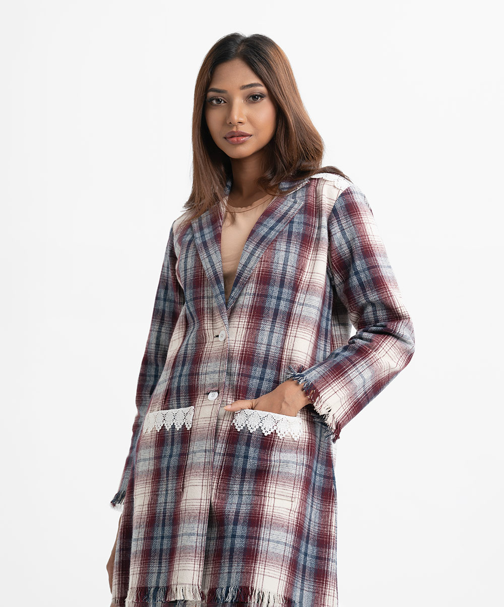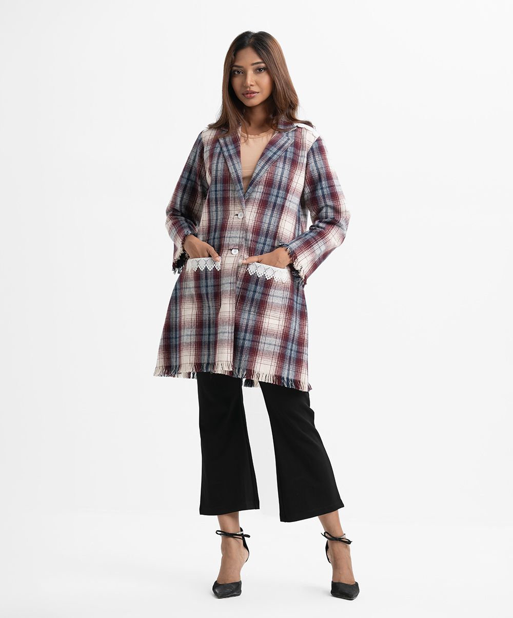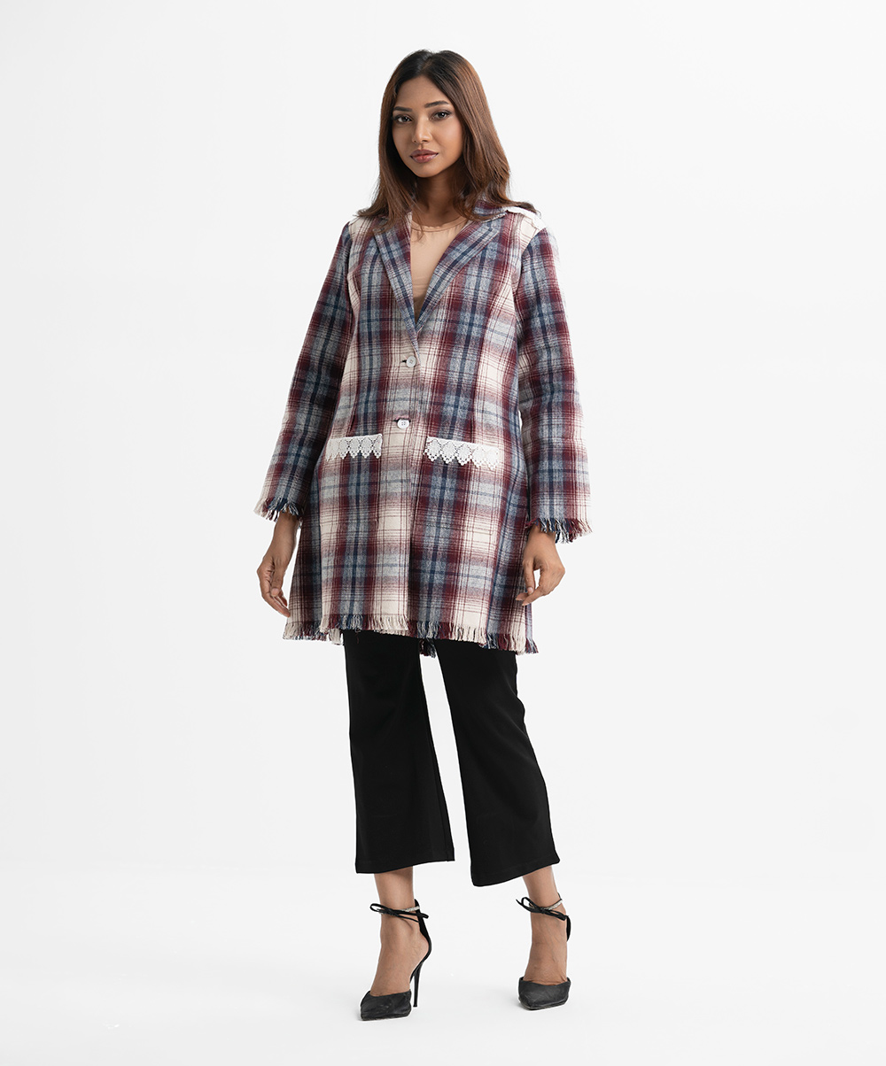 Women’s single-breasted check trench coat in flannel fabric. Lapel collar, full sleeves. Lace detail at yoke and two front pockets.