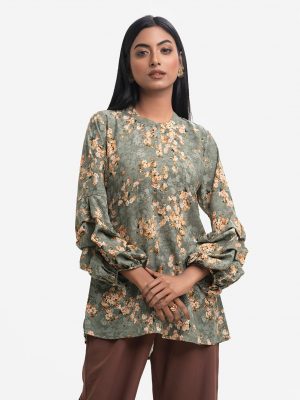 Round neck A-line tunic with shrug in blended georgette fabric. Karchupi at the front with a tie cord.