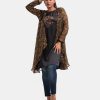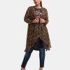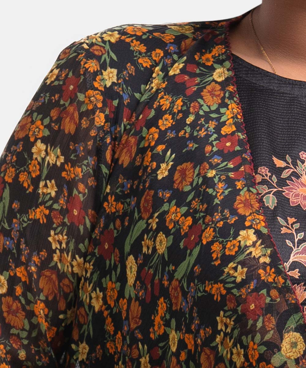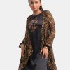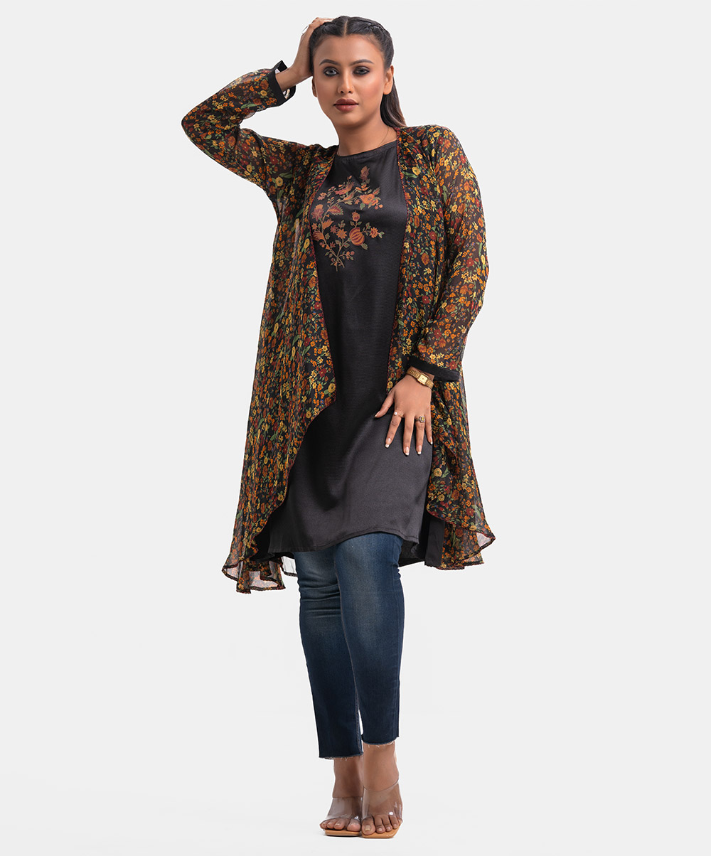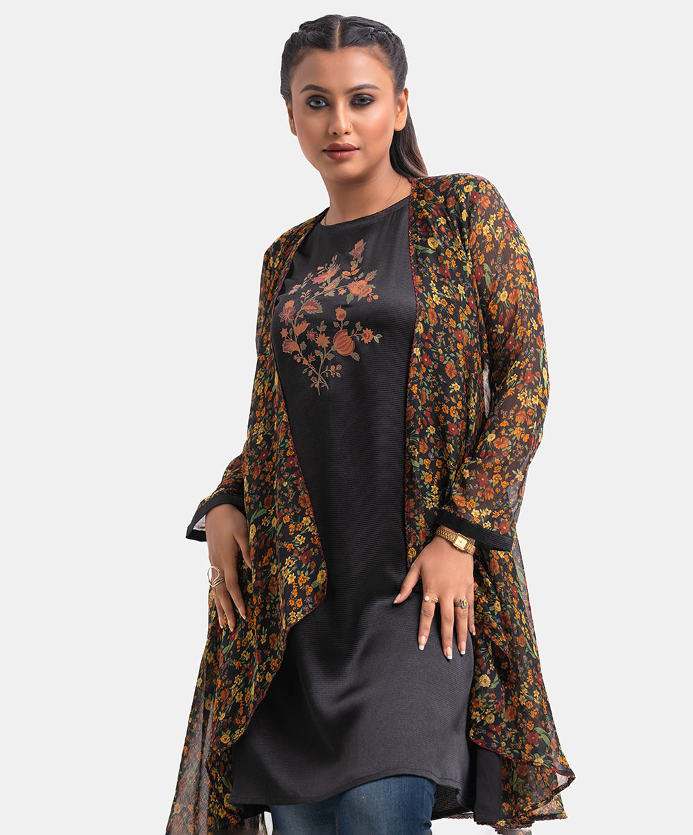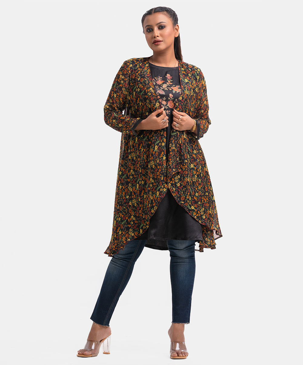 A-line tunic with shrug in georgette and crepe fabric. Sleeveless round neck inner tunic in crepe fabric. Shirt-style open front shrug in georgette fabric.