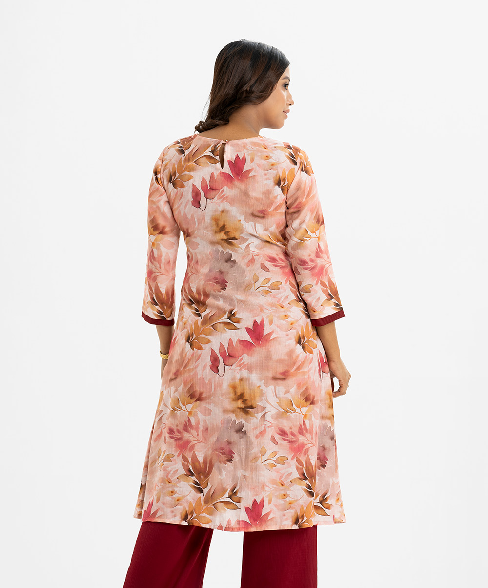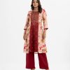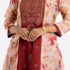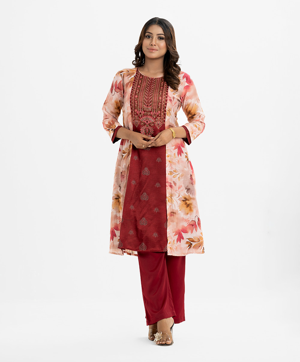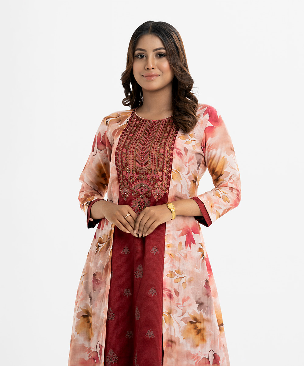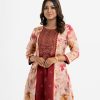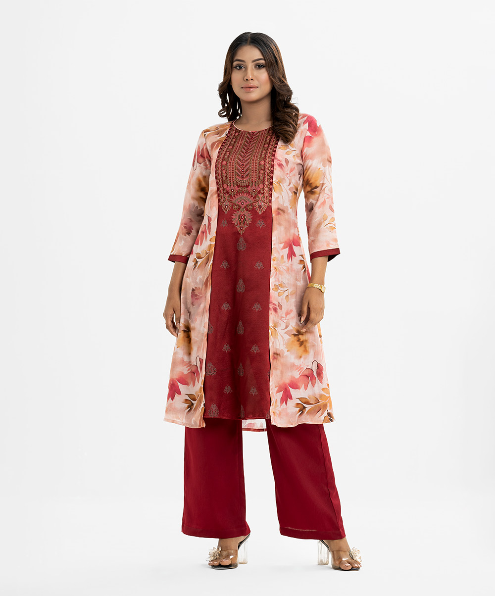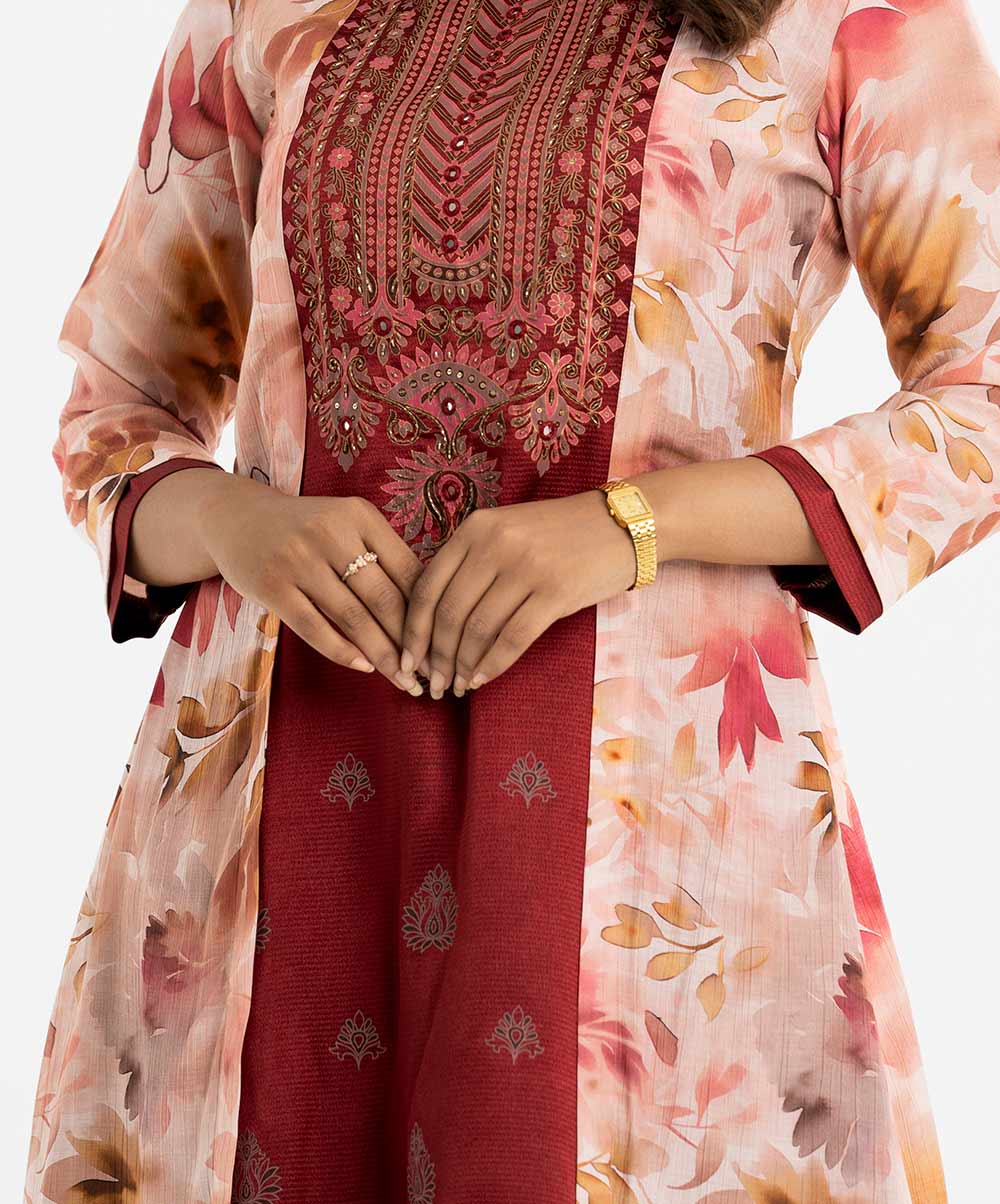 Women’s shrug-style tunic in blended cotton fabric attached shrug with crepe fabric tunic. Round neck, three-quarter sleeves. Karchupi at front.