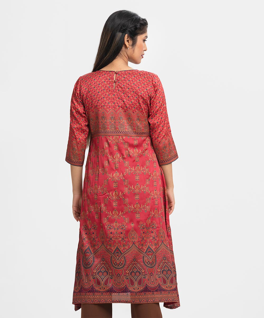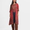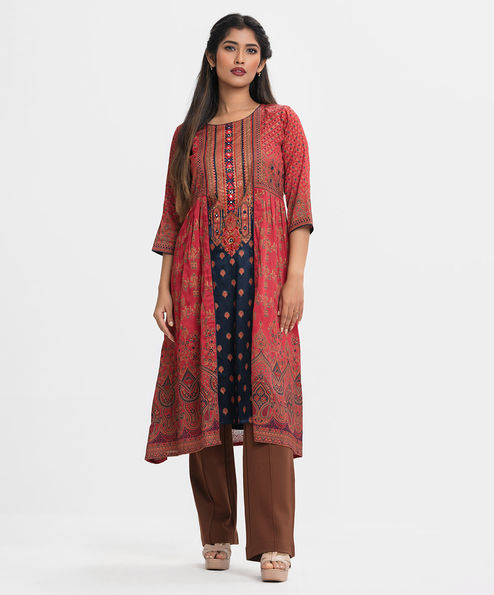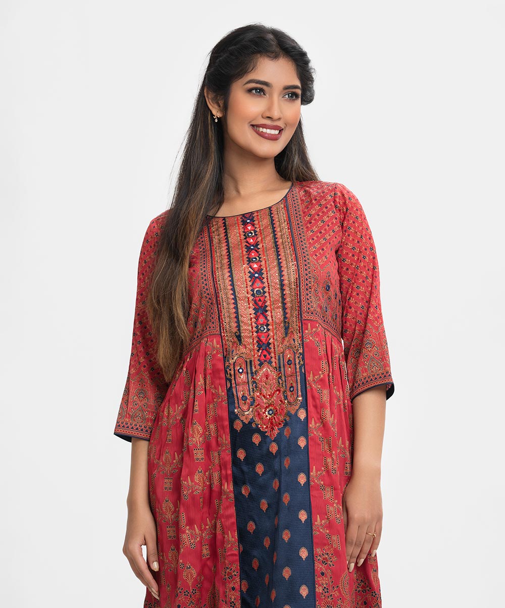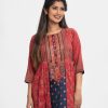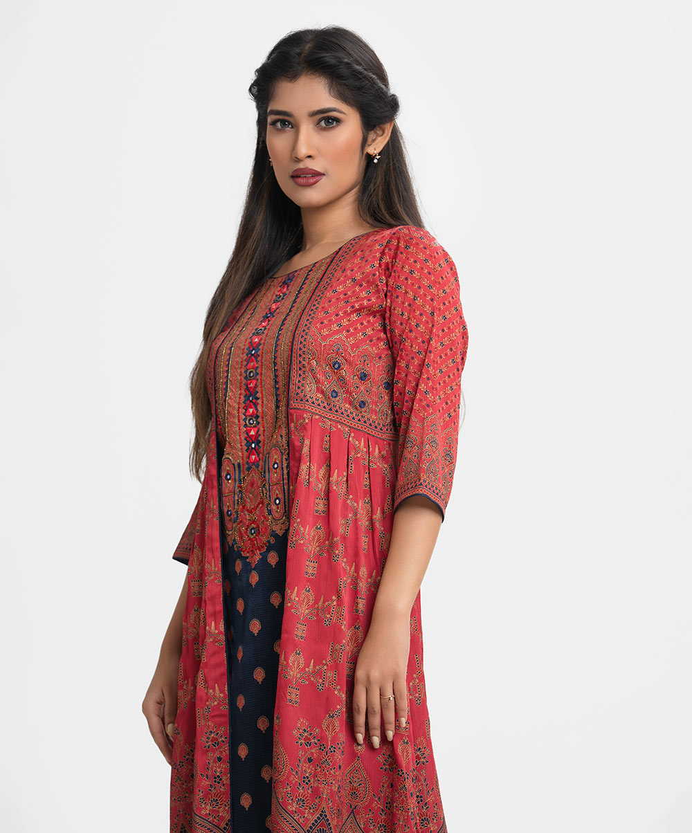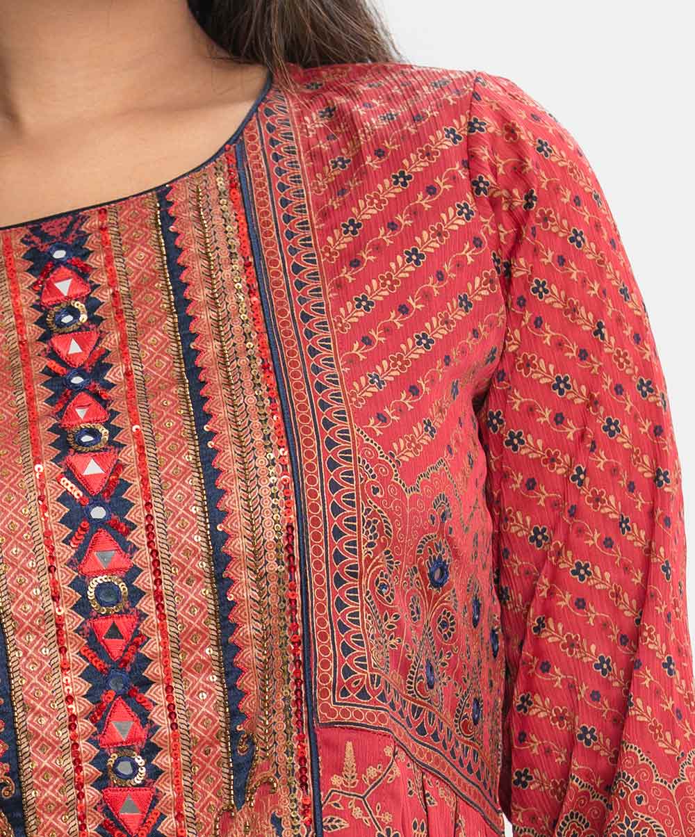 Round neck tunic with shrug in crepe fabric. Three-quarter sleeves with karchupi at the front.
