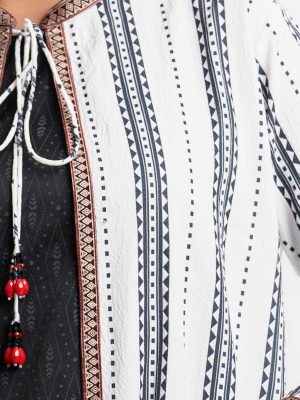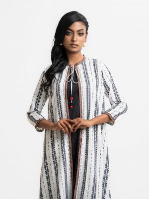 Sleeveless short tunic in tencel fabric. And a printed tassel tie open front, full sleeves shrug in tencel fabric.