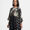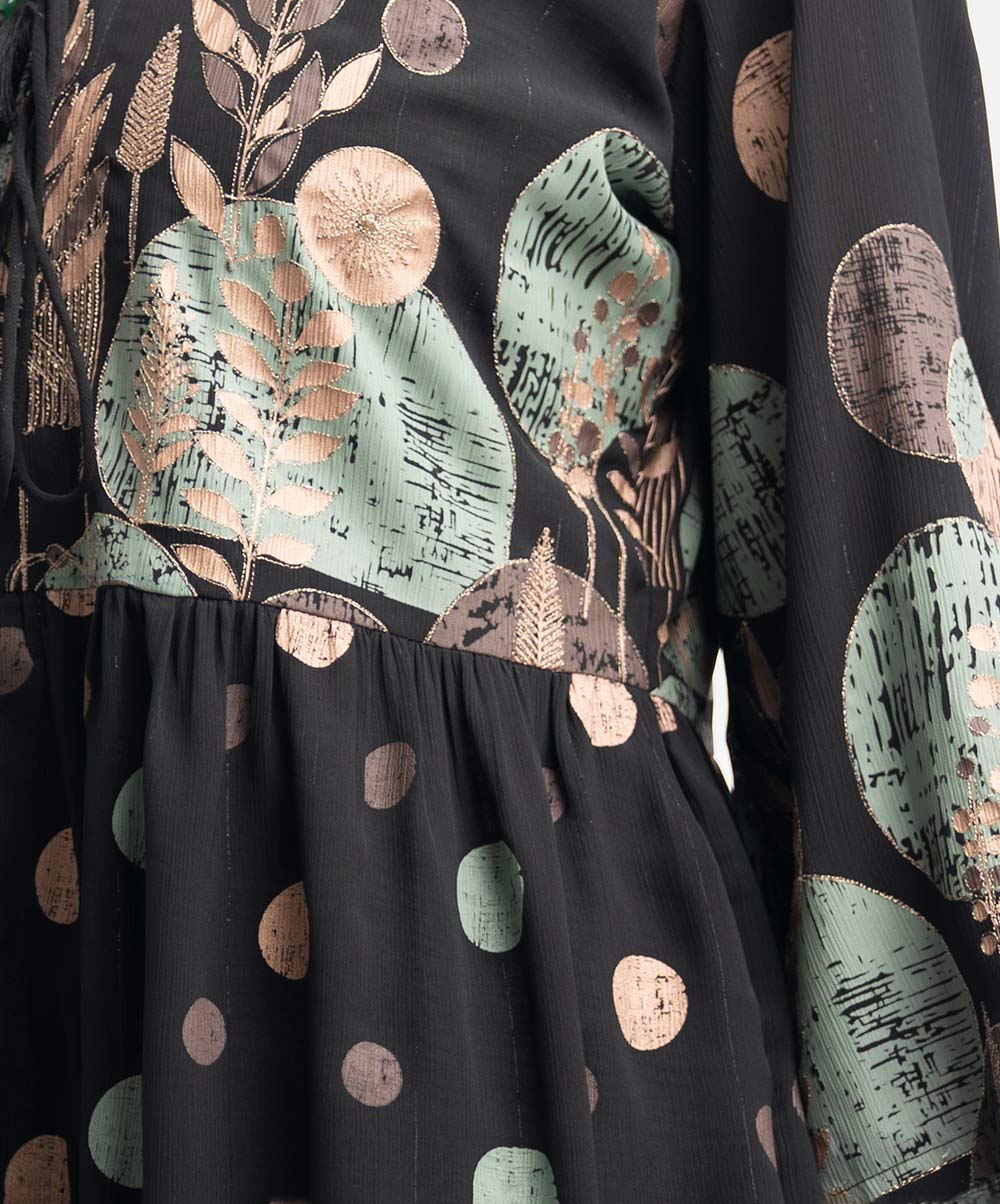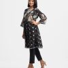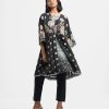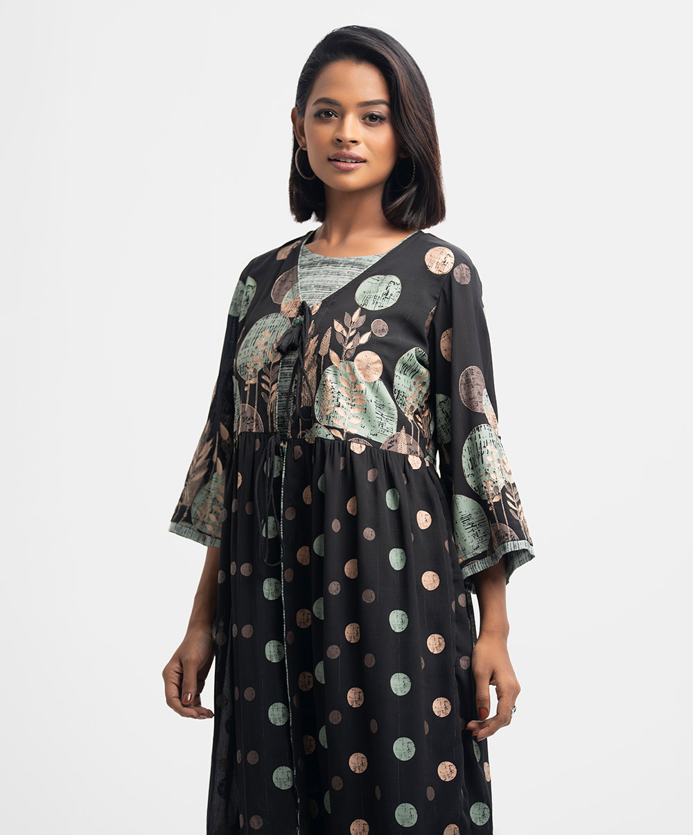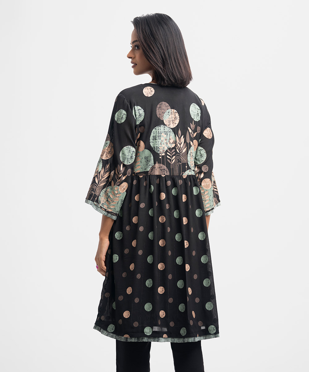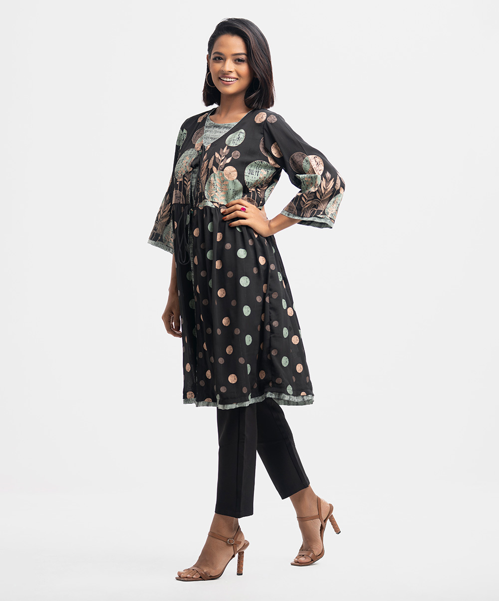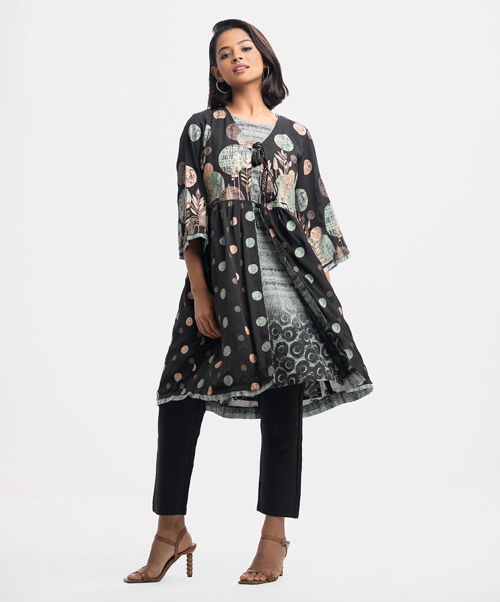 Open front tassel-tied shrug in georgette fabric with three-quarter sleeves. Complemented with a tunic attached inside.