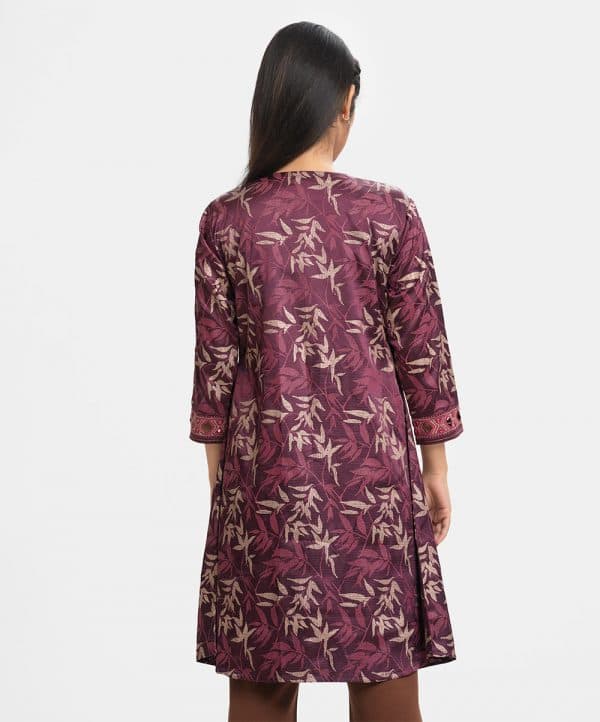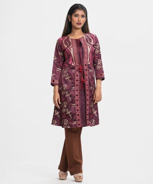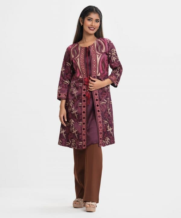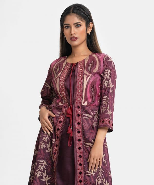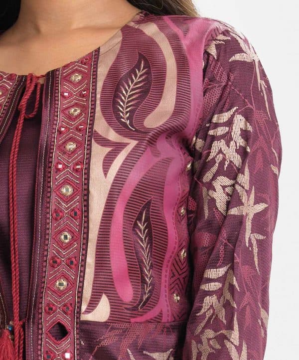 Round neck A-line long shrug in crepe fabric. Three-quarter sleeves, karchupi at the front and cuffs. Tie-cord at neck and waistline.