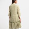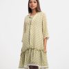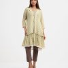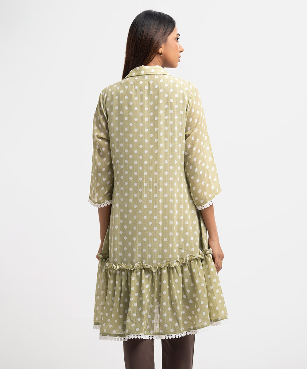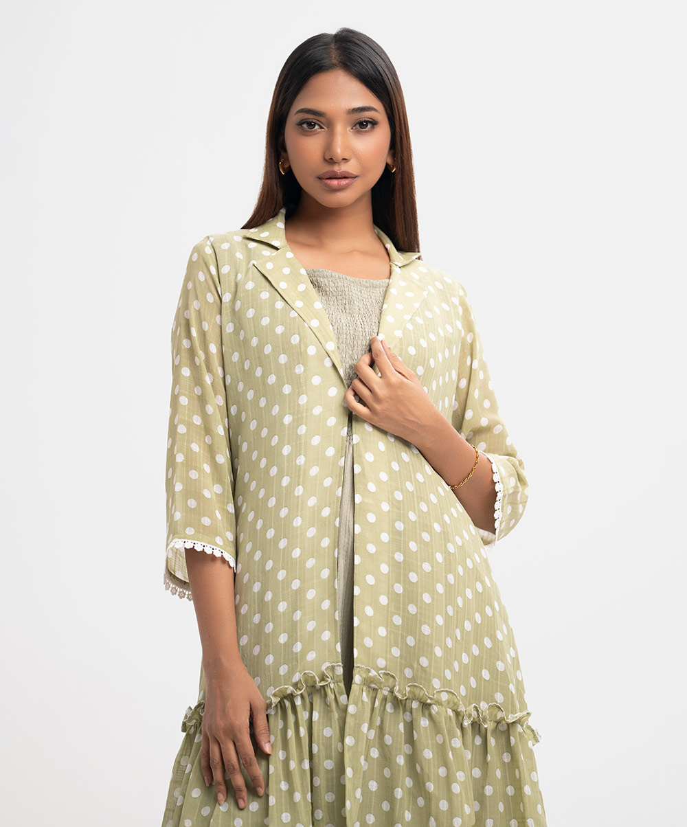 Lapel collar shrug and tunic set in blended georgette fabric. The flared shrug is designed with three-quarter sleeves and lace details. Complemented with a sleeveless smoked tunic.