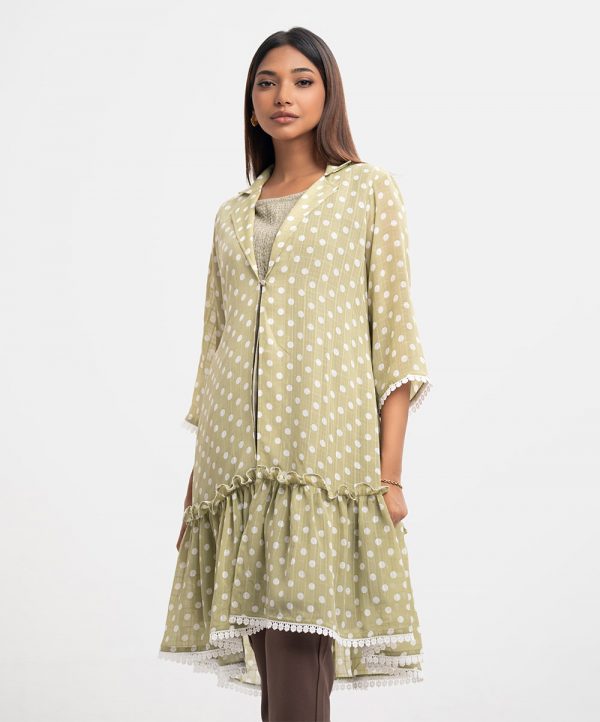 Lapel collar shrug and tunic set in blended georgette fabric. The flared shrug is designed with three-quarter sleeves and lace details. Complemented with a sleeveless smoked tunic.