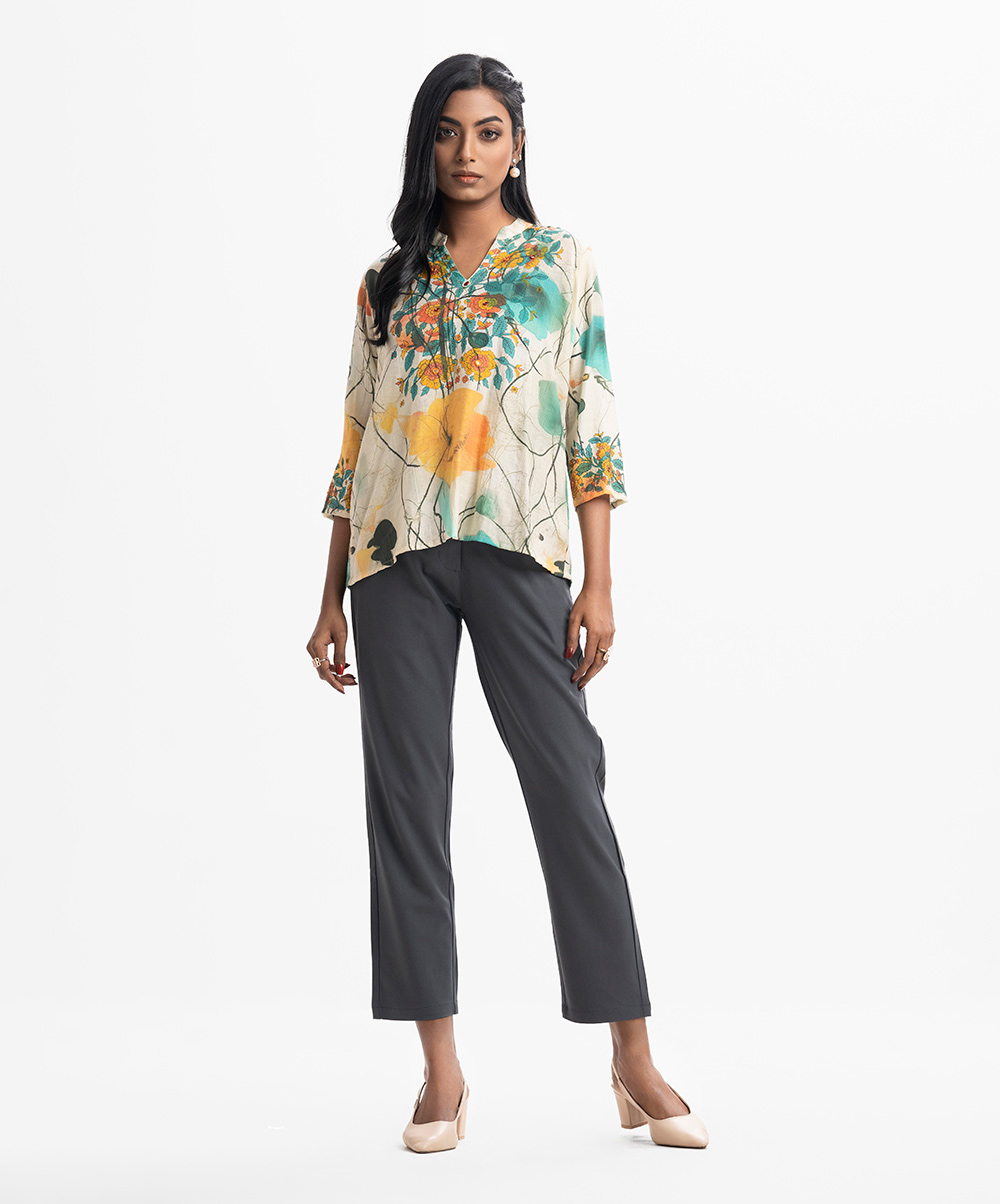 V-neck woven top in cotton-blended fabric. Three-quarter sleeves with karchupi at the front.