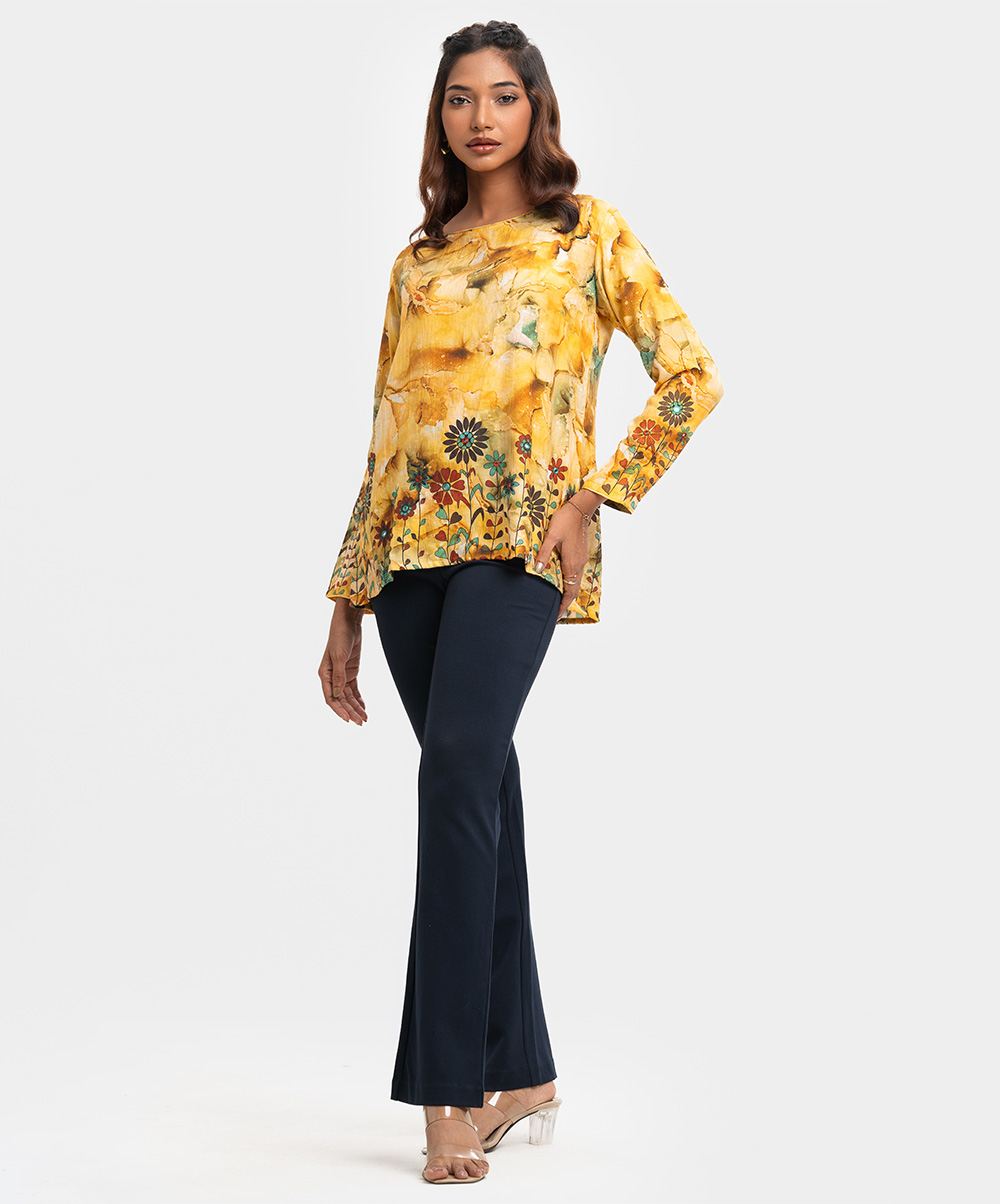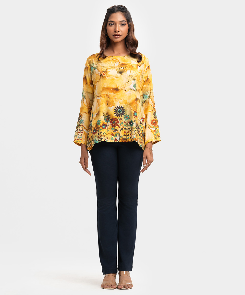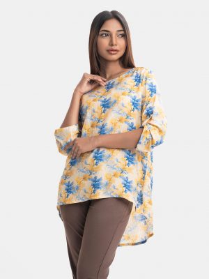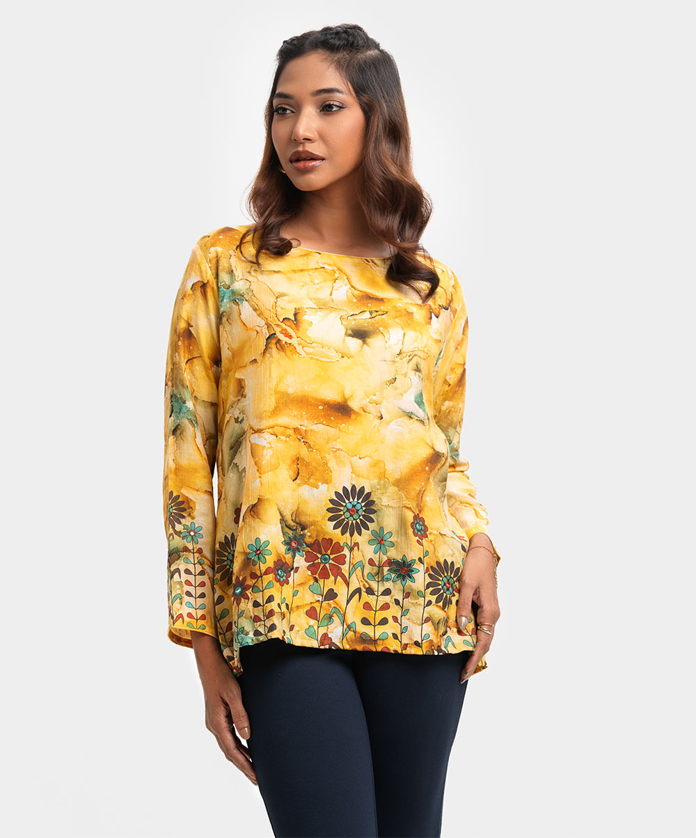 Women’s A-line woven short top in printed blended cotton fabric. Boat neck, full sleeves. Karchupi at sleeves & hemline.