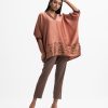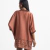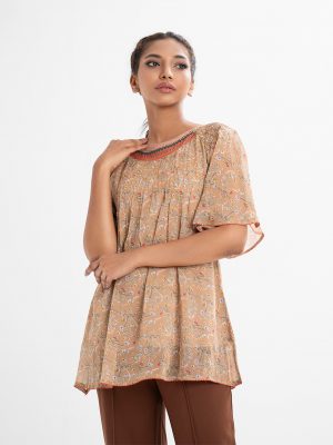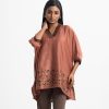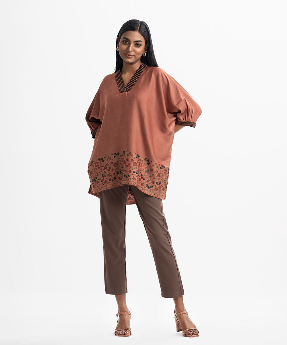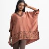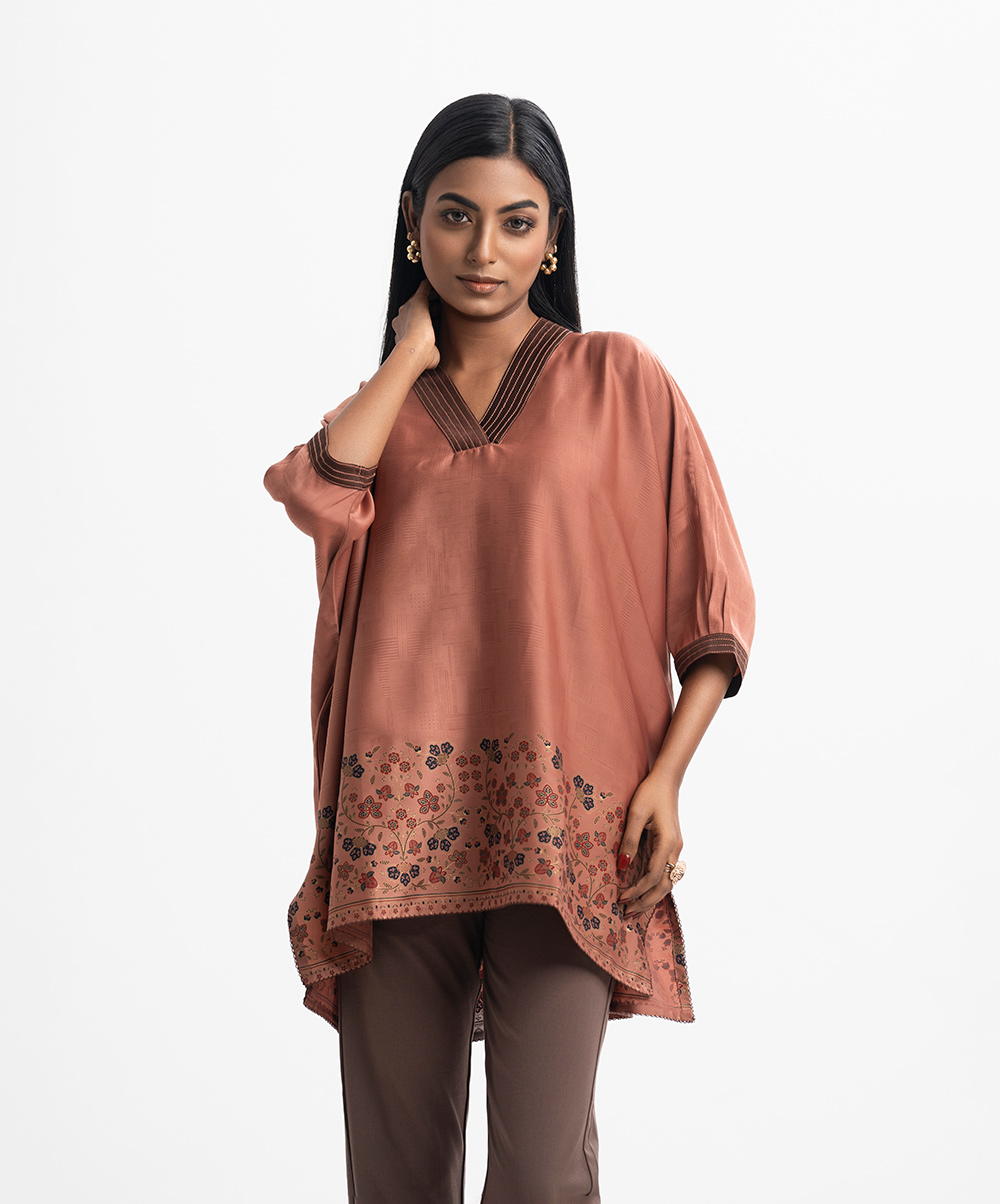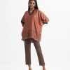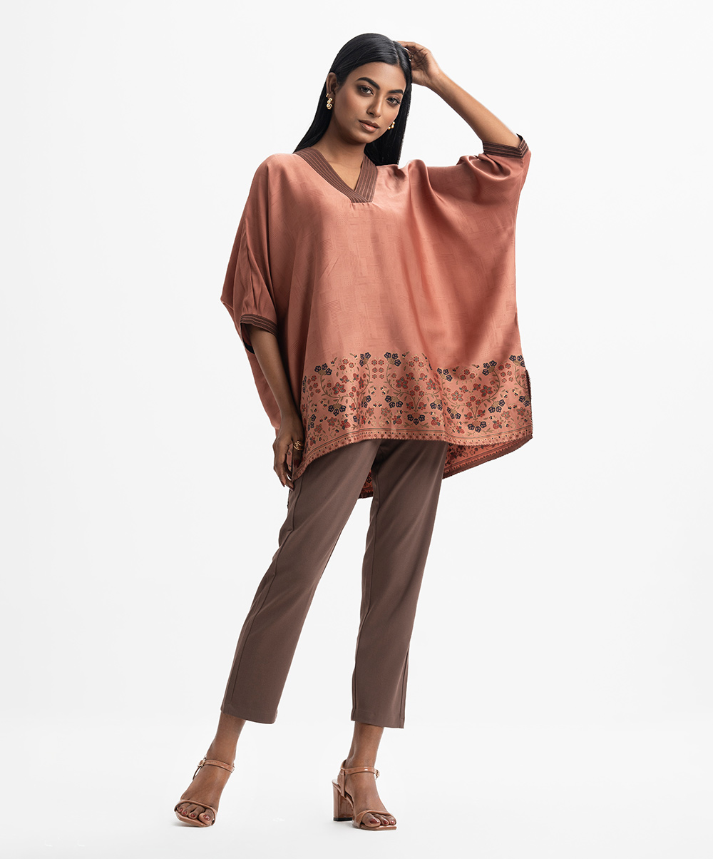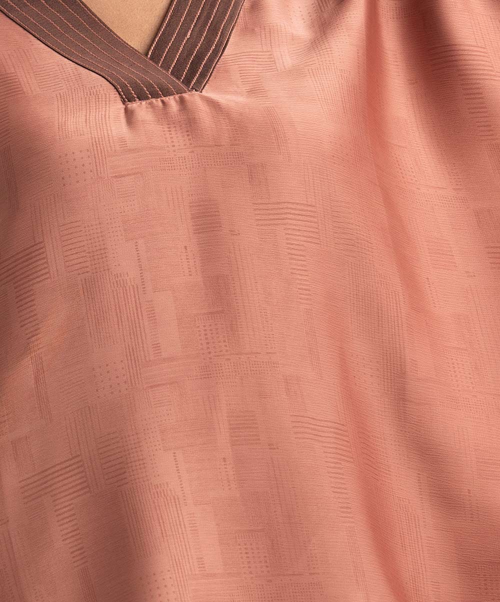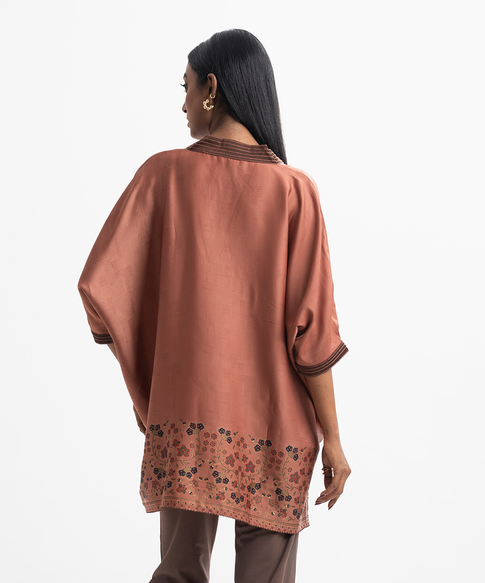 Kimono-neck woven top in joom fabric. Kaftan patterned, matching patch on the collar and cuffs.