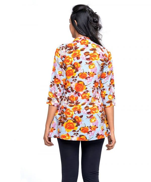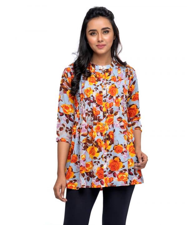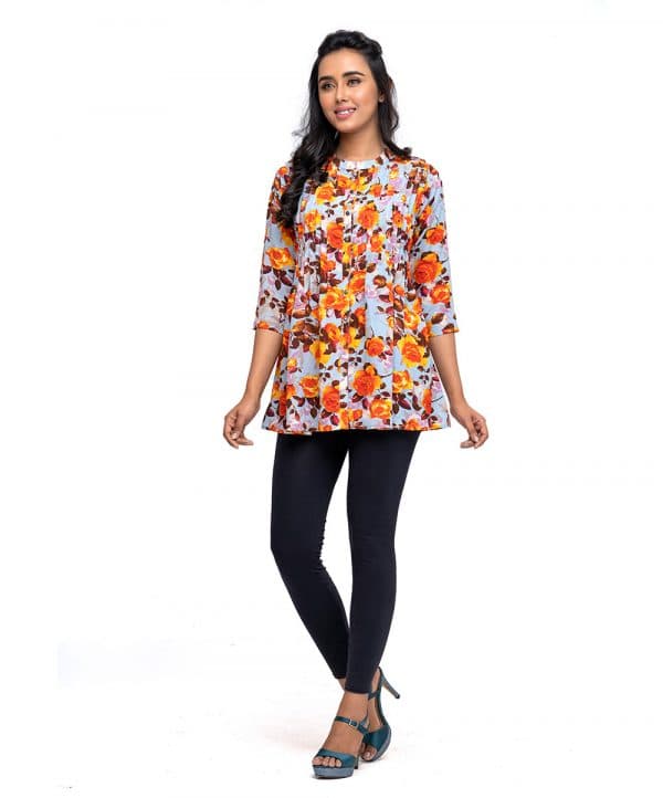 Multi-color printed shirt Tunic in Georgette Fabric with mock neck, quarter sleeves & pin tuck.
