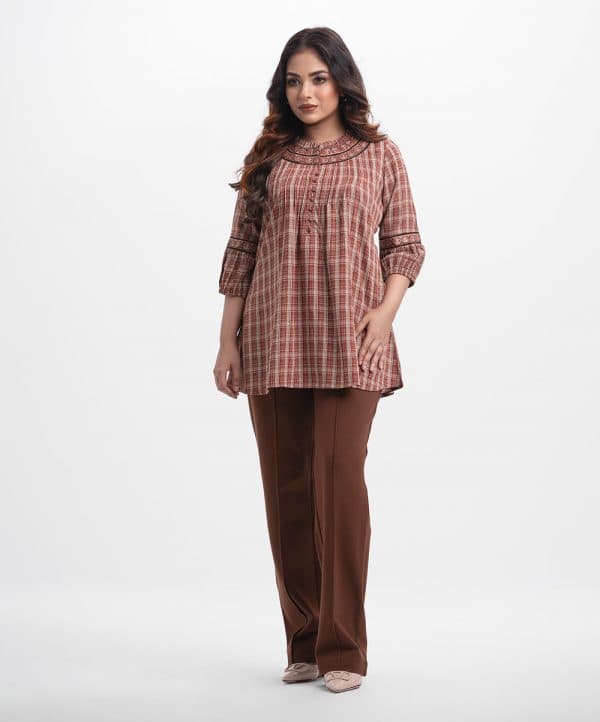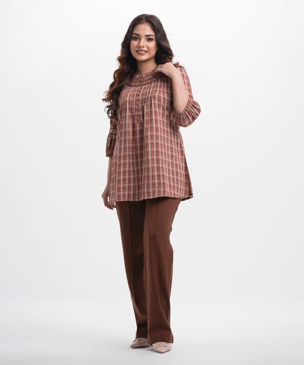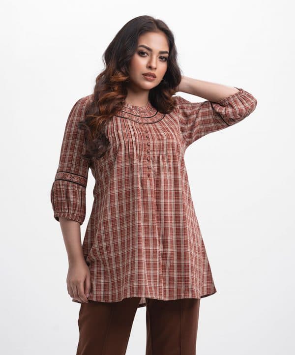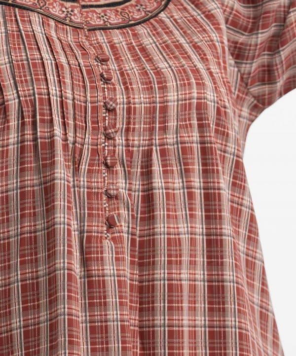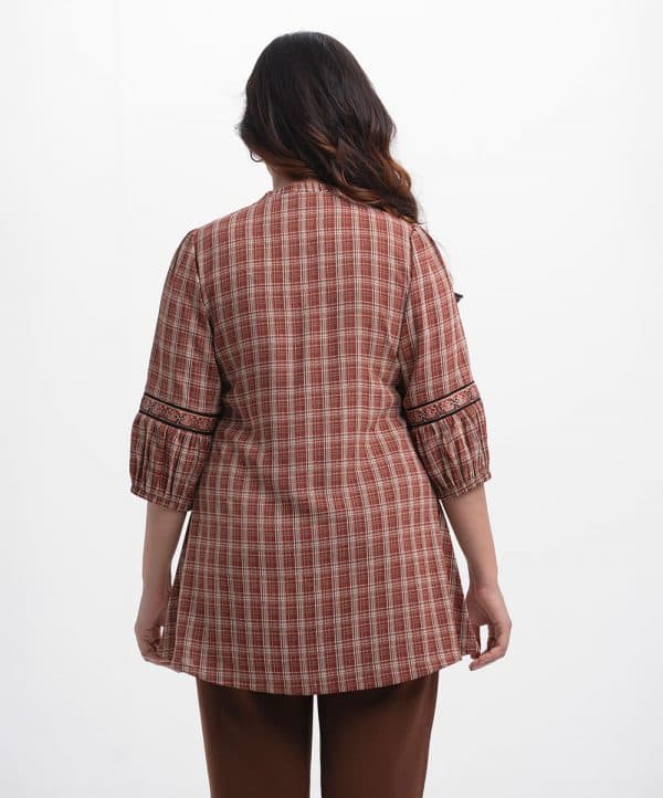 Women’s check printed tent-style top in georgette fabric. Frill round neck, three-quarter balloon sleeves. Pintuck, buttons and cutwork at front.