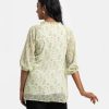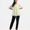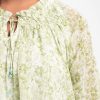 Women’s A-line tops in printed georgette fabric with viscose lining. Frill neck with smocked design and tassel tie, bishop sleeves.