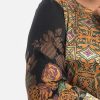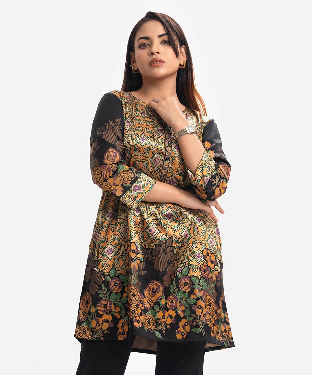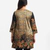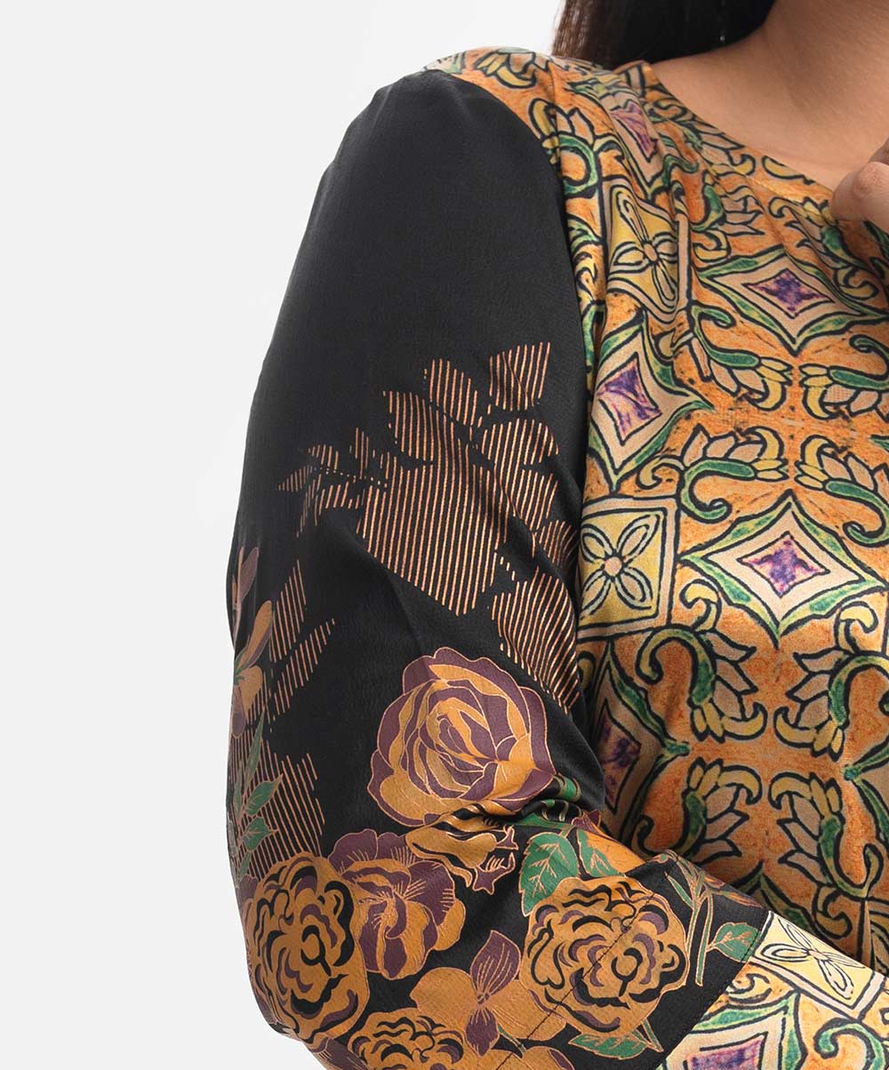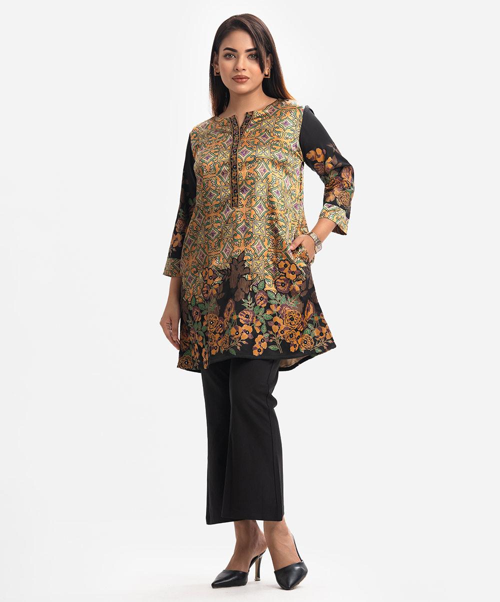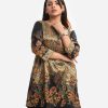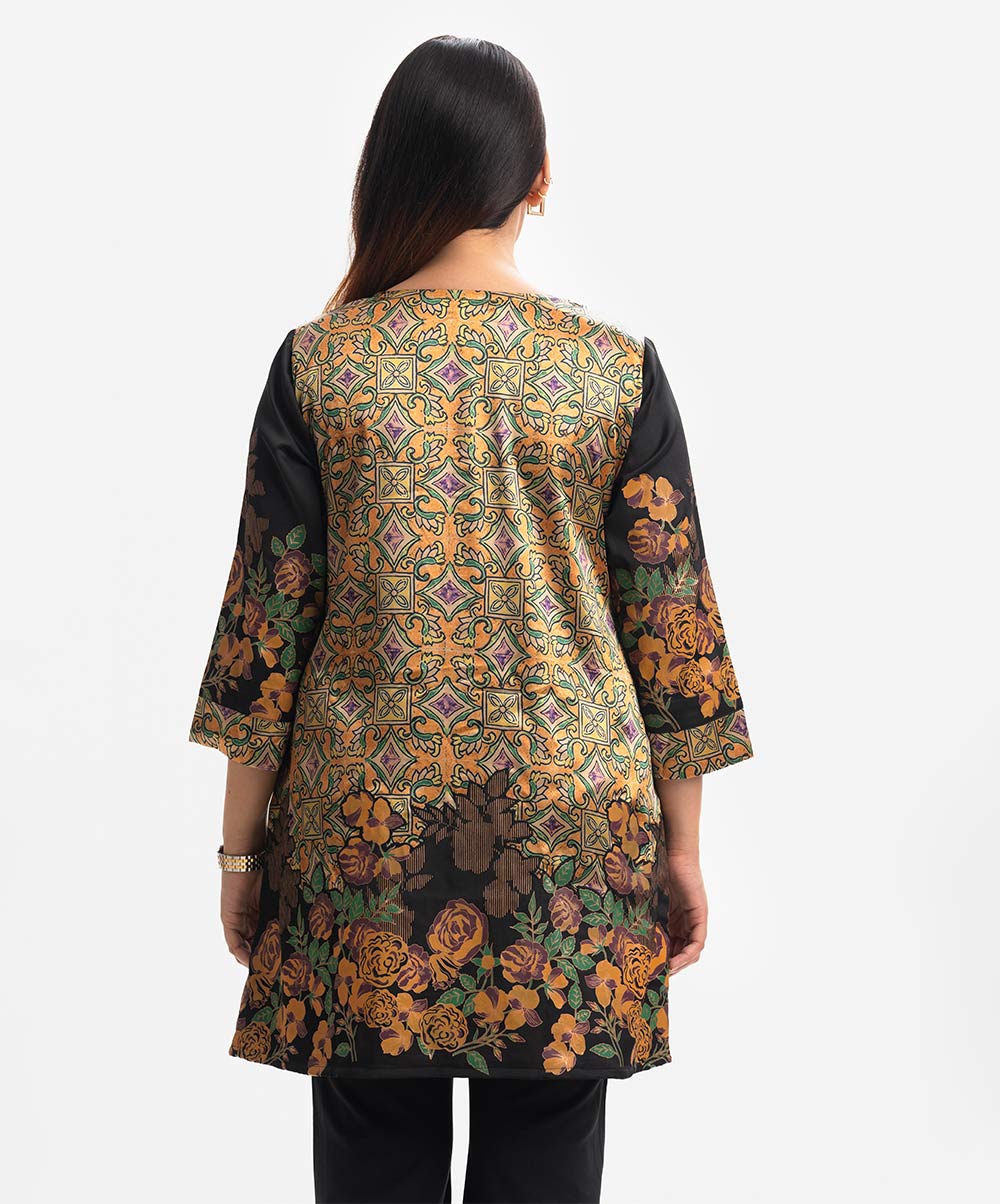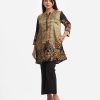 V-neck A-line top in satin-crepe fabric. Three-quarter sleeves with inseam side pockets.Karchupi at the front.
