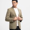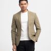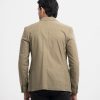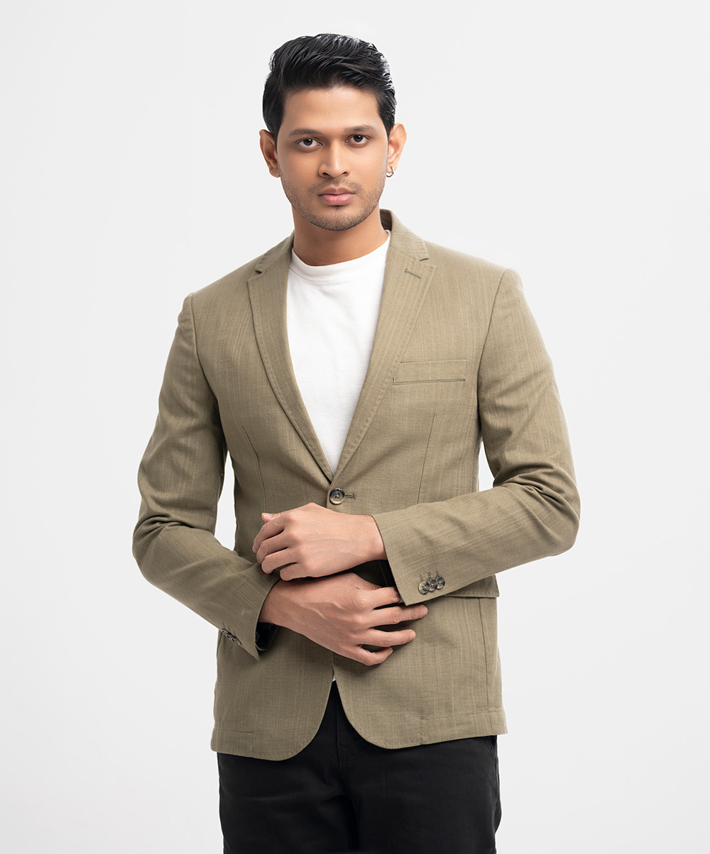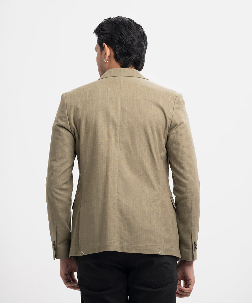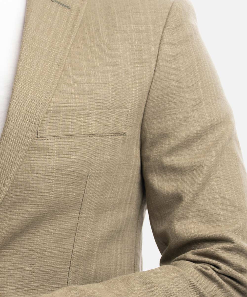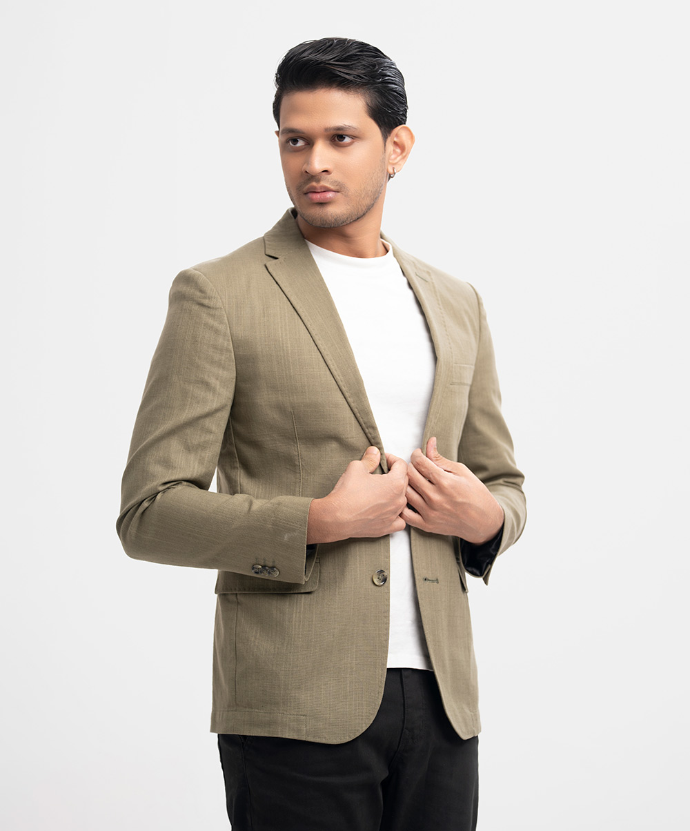 Single-breasted business casual blazer in soft, ramie cotton fabric with a stretchable silhouette. Notched lapels with a decorative buttonhole, two buttons at front, and decorative buttons at cuffs. Welt chest pocket, front pockets with flap with inner pockets. Lined.