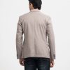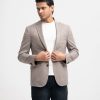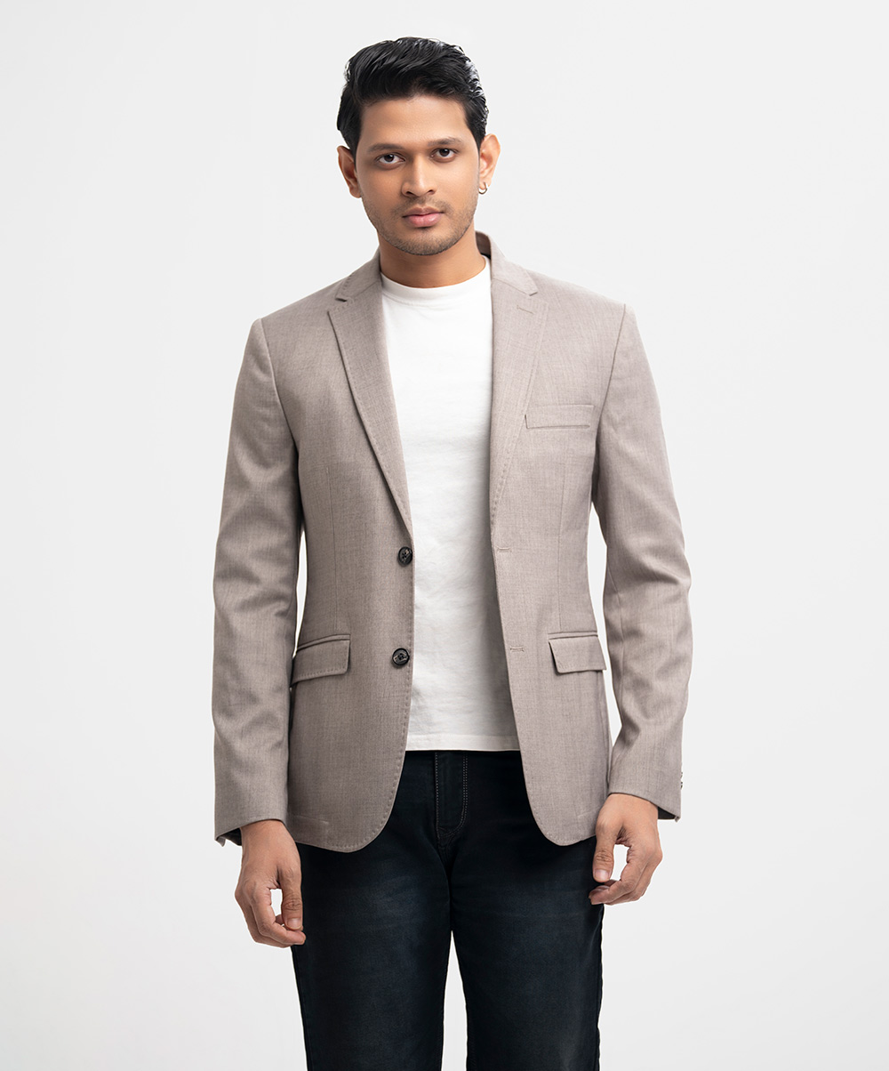 Single-breasted business casual blazer in soft, poly woven fabric with a stretchable silhouette. Notched lapels with a decorative buttonhole, two buttons at front, and decorative buttons at cuffs. Welt chest pocket, front pockets with flap with inner pockets. Lined.