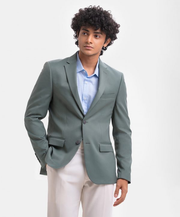 Slim-fit, single-breasted business formal blazer in soft, woven fabric with a stretchable silhouette. Notched lapels with a decorative buttonhole, two buttons at front, and decorative buttons at cuffs. Welt chest pocket, front pockets with flap and inner pockets. Lined.