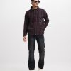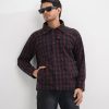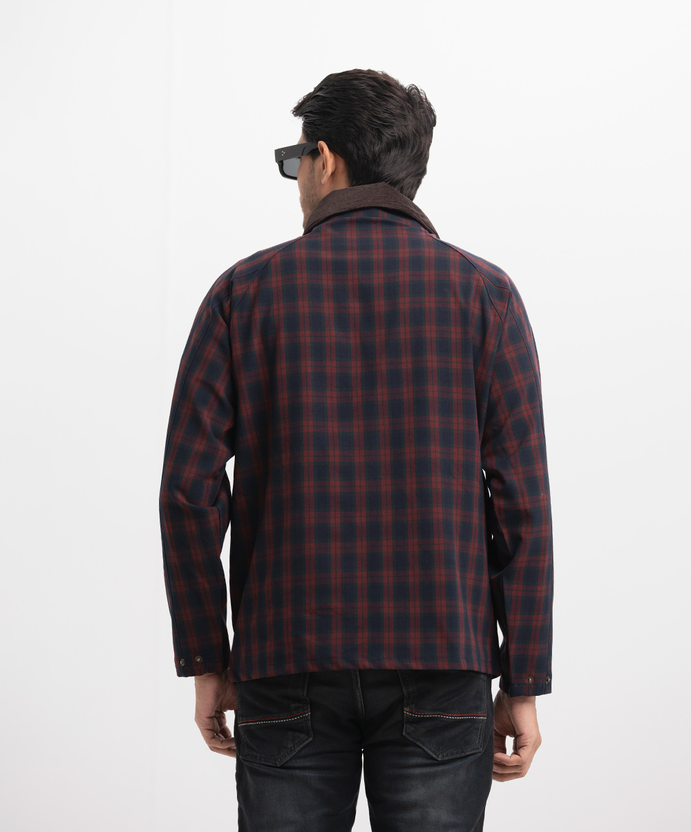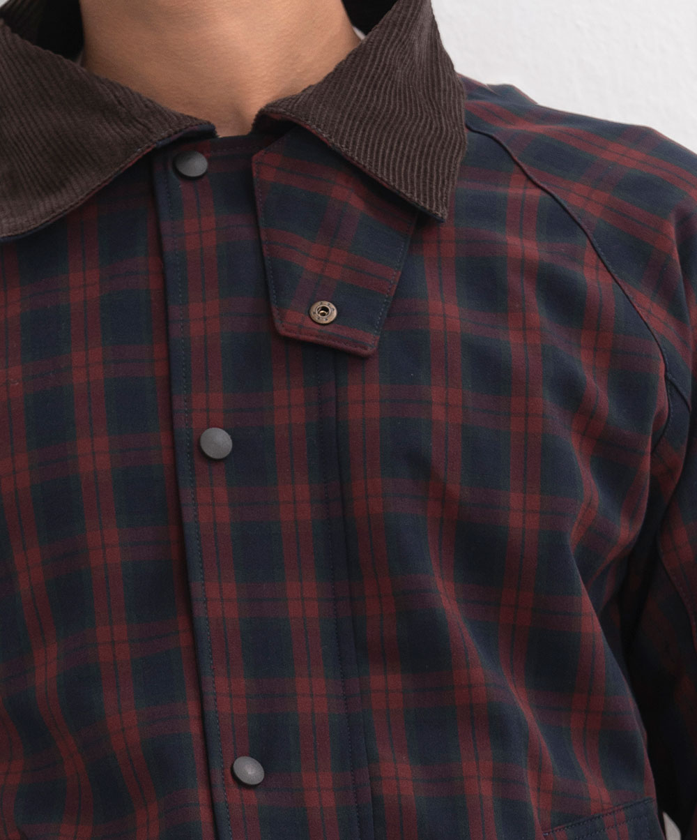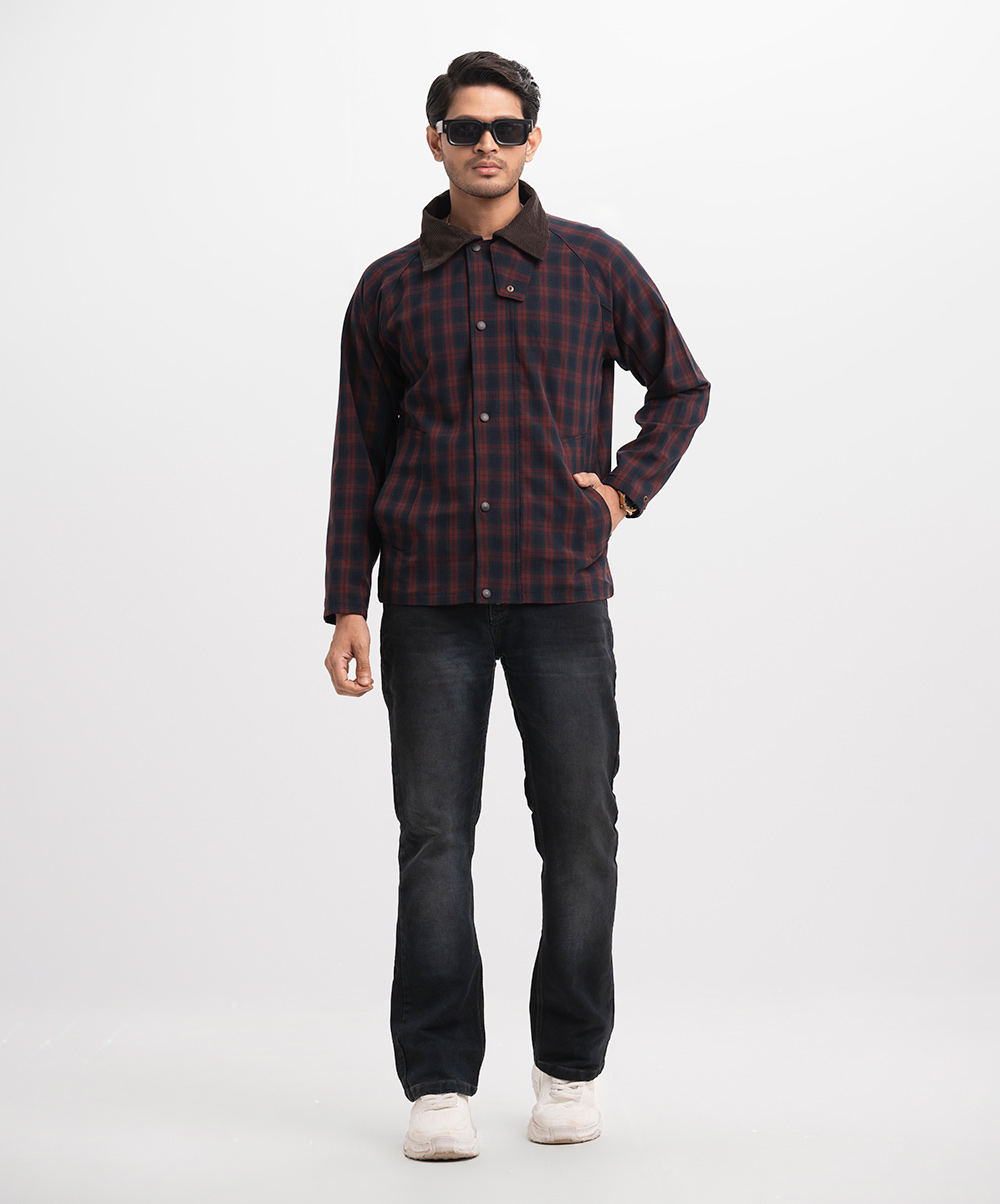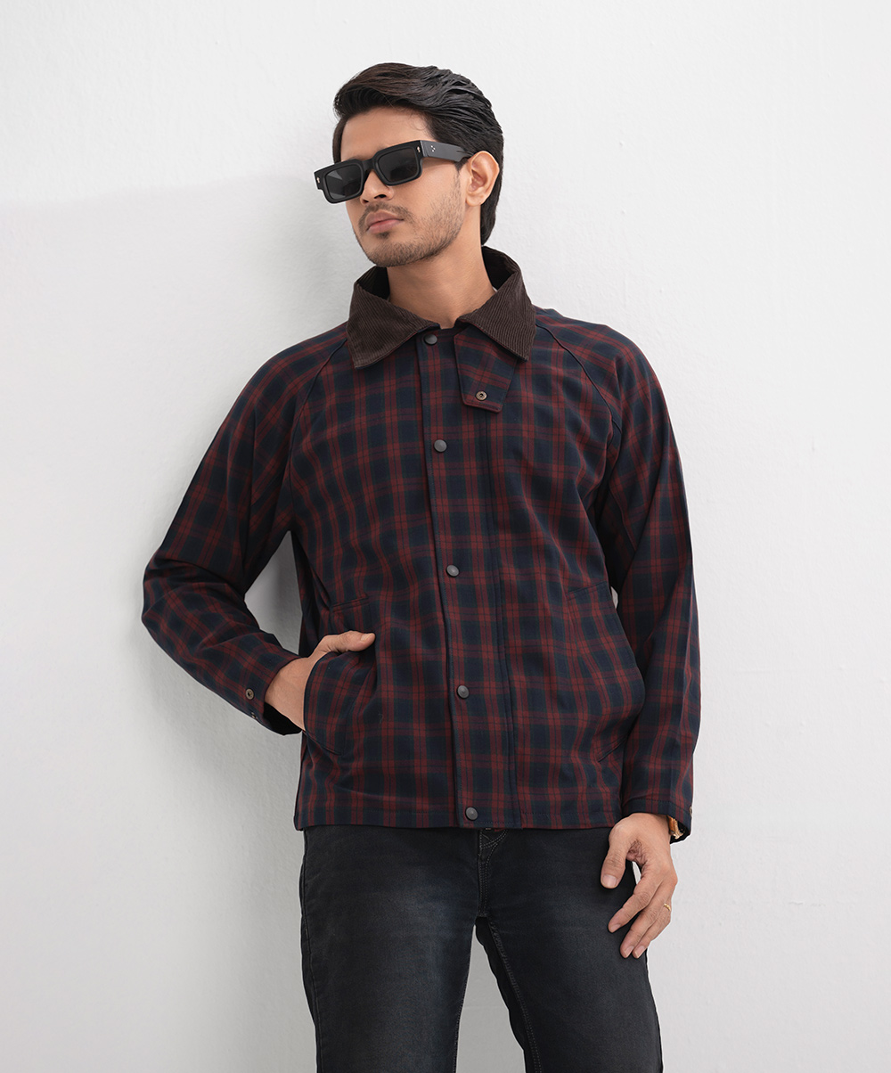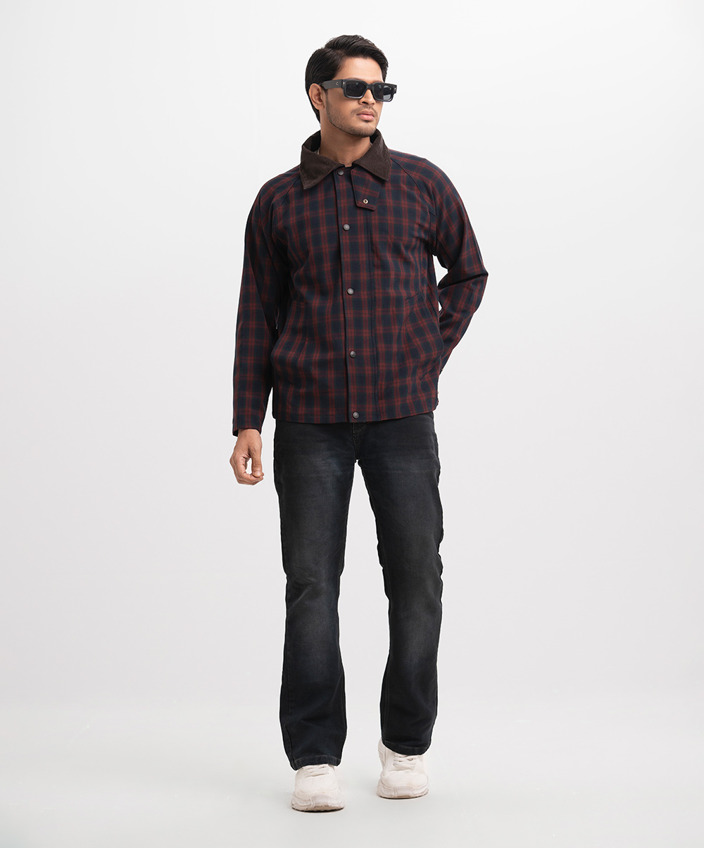 Men’s biker jacket in stretchable blended fabric. Classic collar in corduroy, zipper at front with wind flap and snap fasteners, long sleeves. Diagonal welt side pockets.