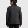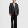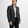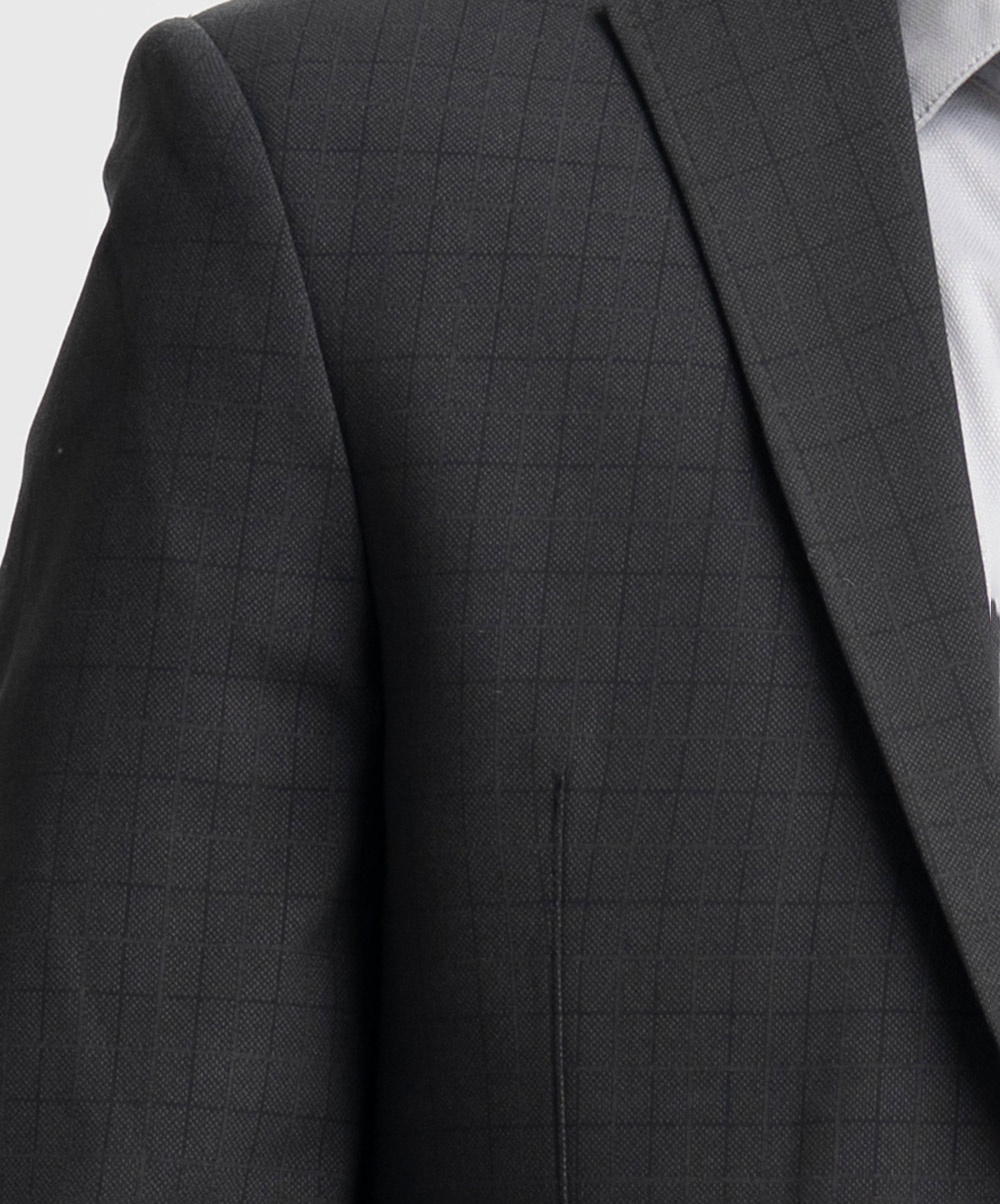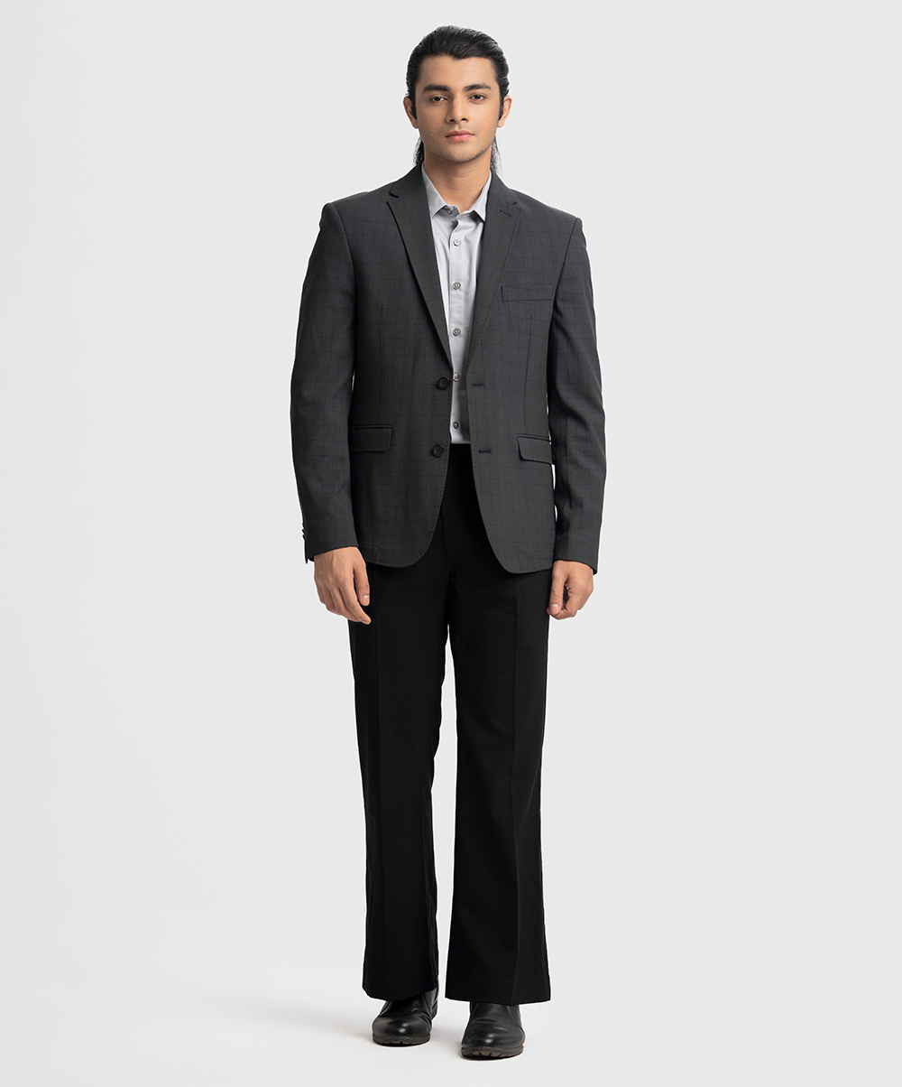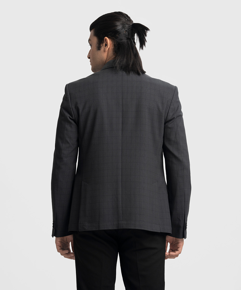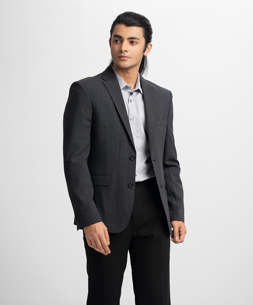 Single-breasted business casual blazer in soft, poly check woven fabric with a stretchable silhouette. Notched lapels with a decorative buttonhole, two buttons at front, and decorative buttons at cuffs. Welt chest pocket, front pockets with flap with inner pockets. Lined