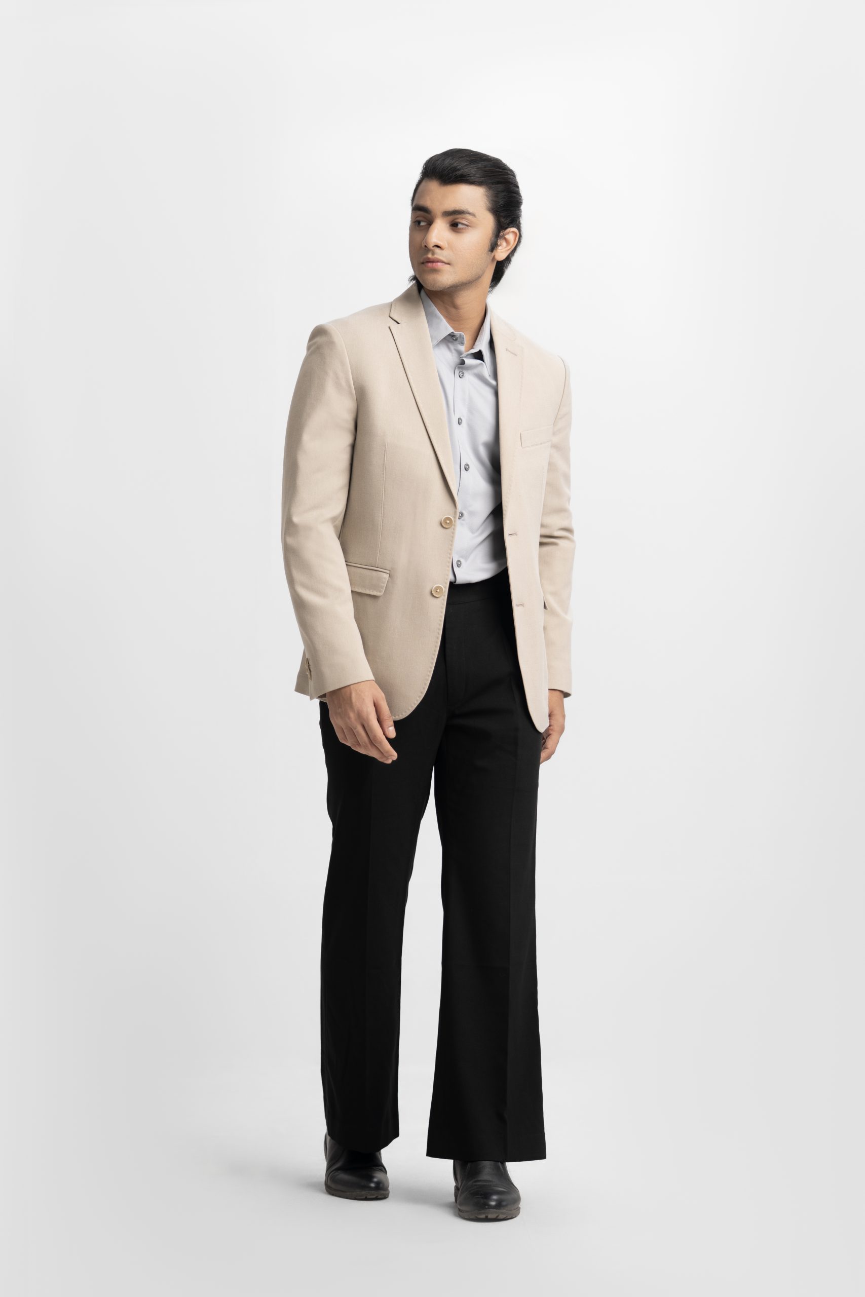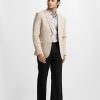 Single-breasted business casual blazer in soft, poly woven fabric with a stretchable silhouette. Notched lapels with a decorative buttonhole, two buttons at front, and decorative buttons at cuffs. Welt chest pocket, front pockets with flap with inner pockets. Lined.”