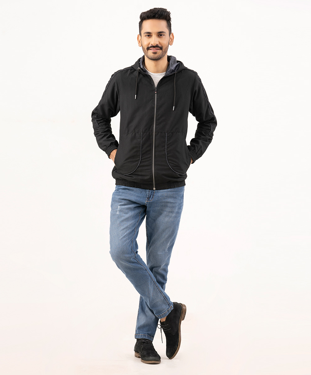 Black hoody jacket in taffeta fabric. All over solid black body with cut and sew style, full cuffed sleeve, zipper opening on front and two front side pocket.