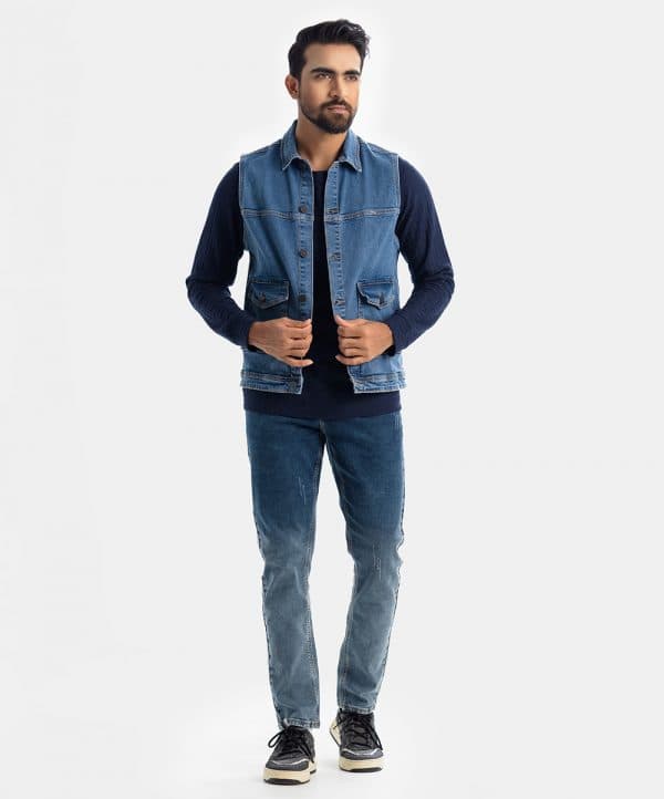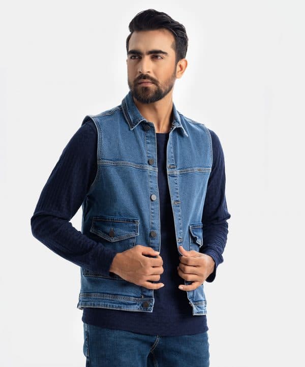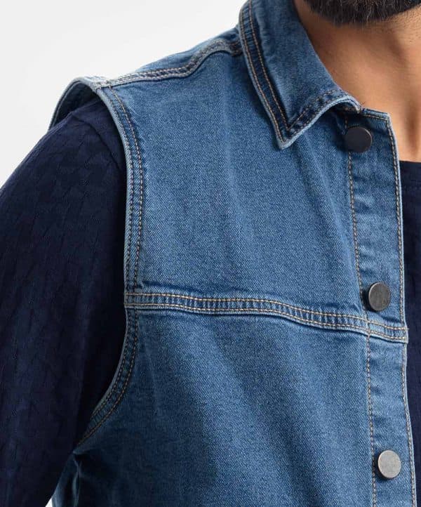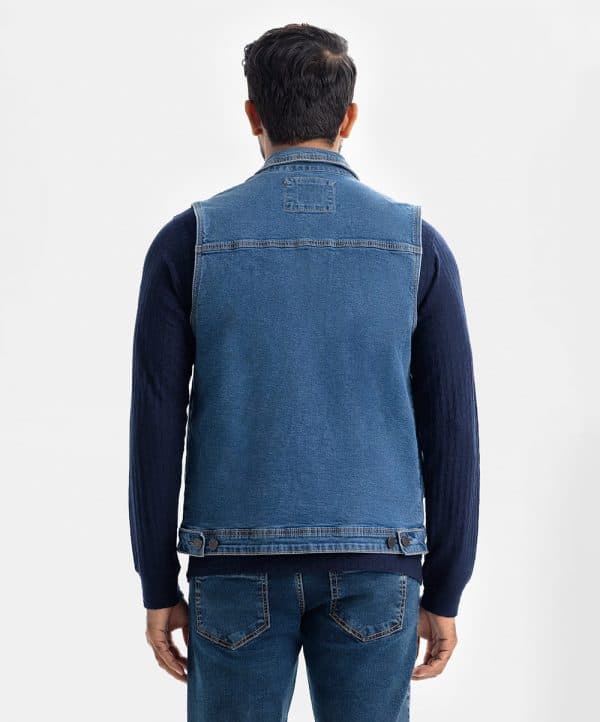 SLEEVELESS DENIM JACKET. collared jacket featuring long sleeves with buttoned cuffs, patch pockets with flaps at the hip, a faded effect and a zip-up front hidden by a placket.