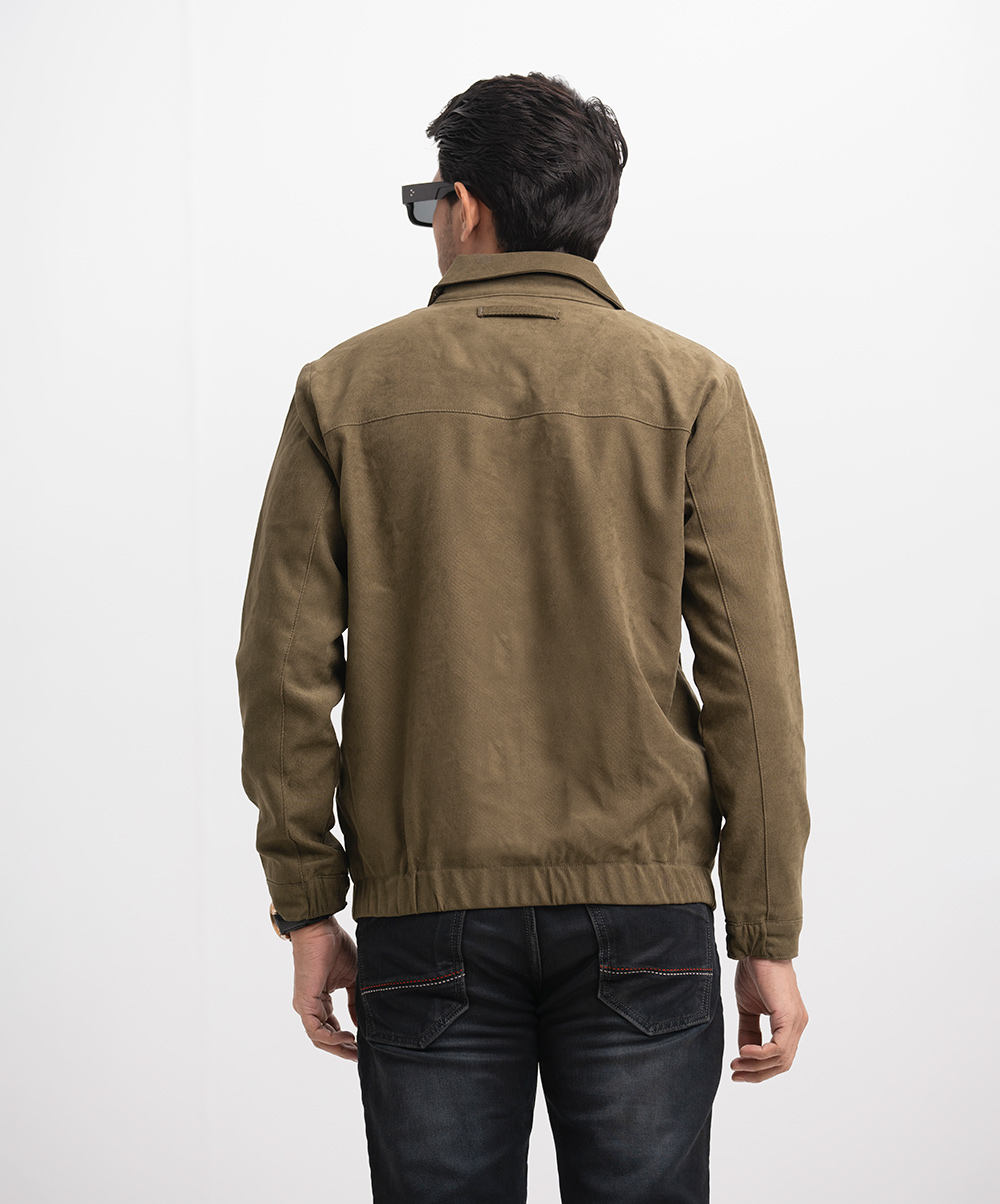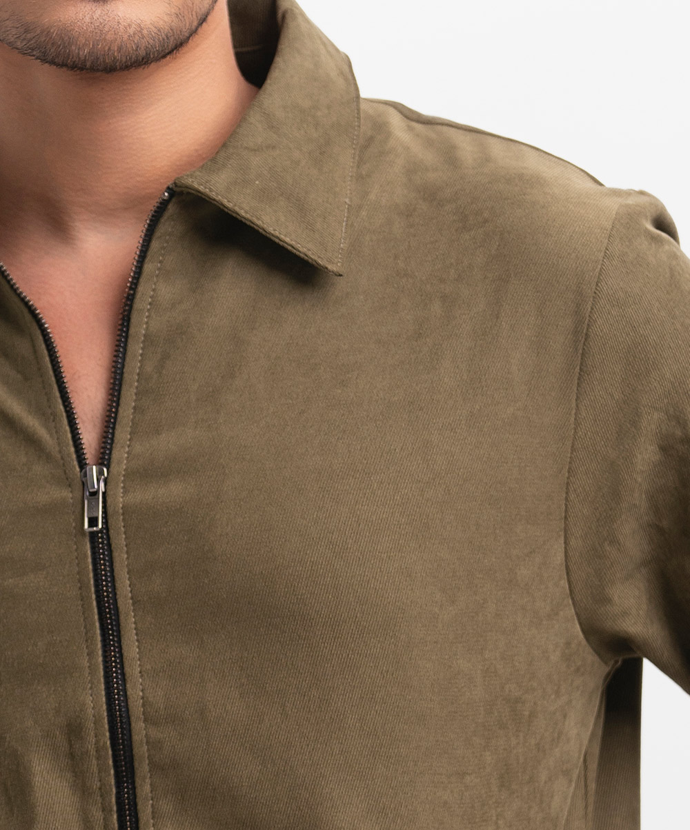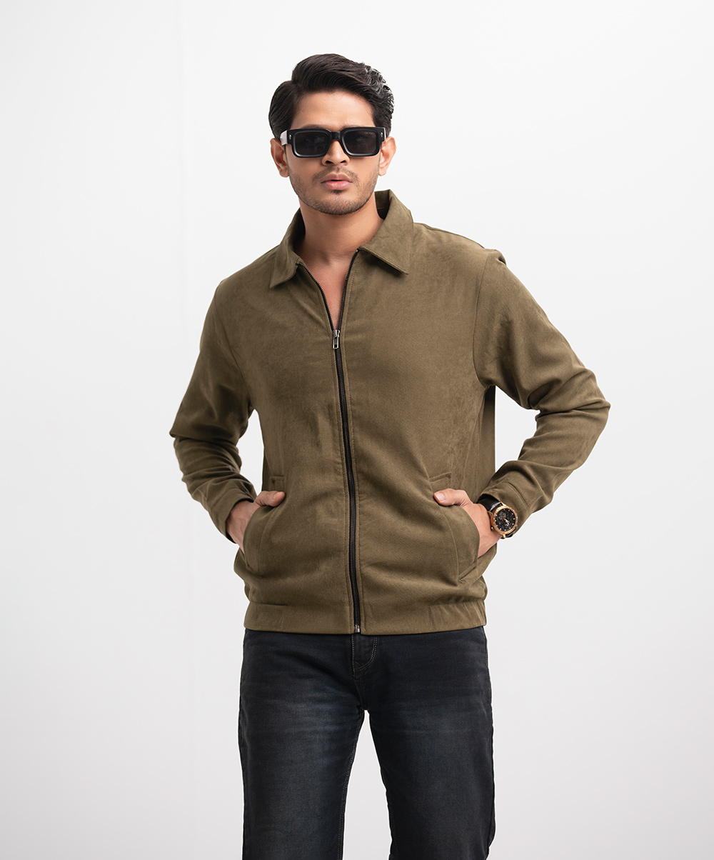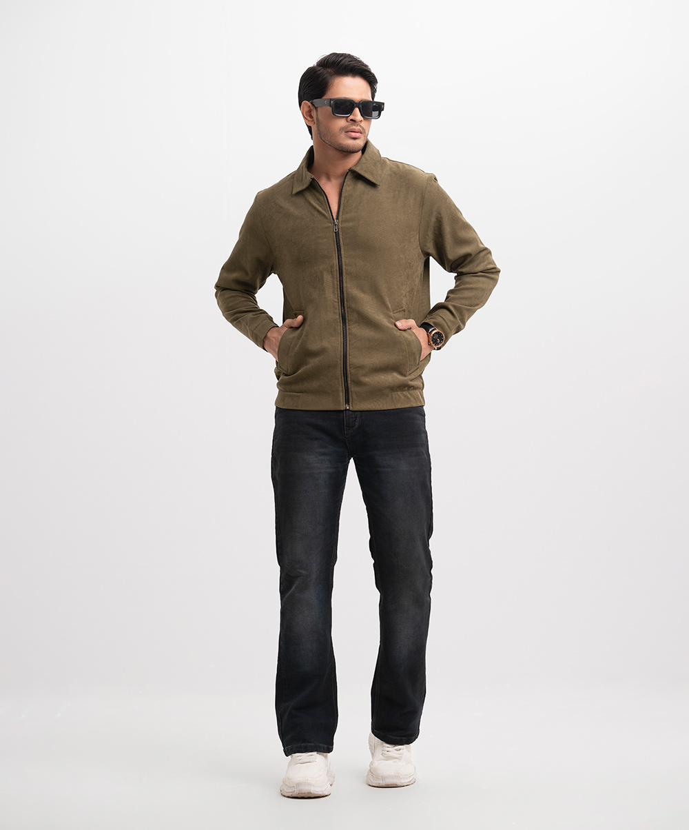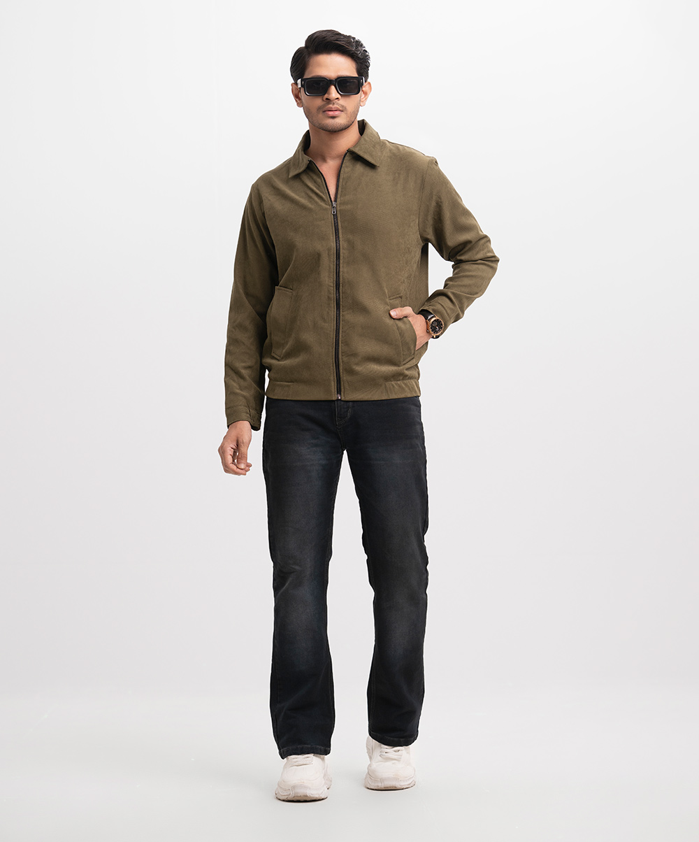 Classic collar winter casual jacket in corduroy fabric. Full-sleeved with zipper opening. Two side pockets with flaps.