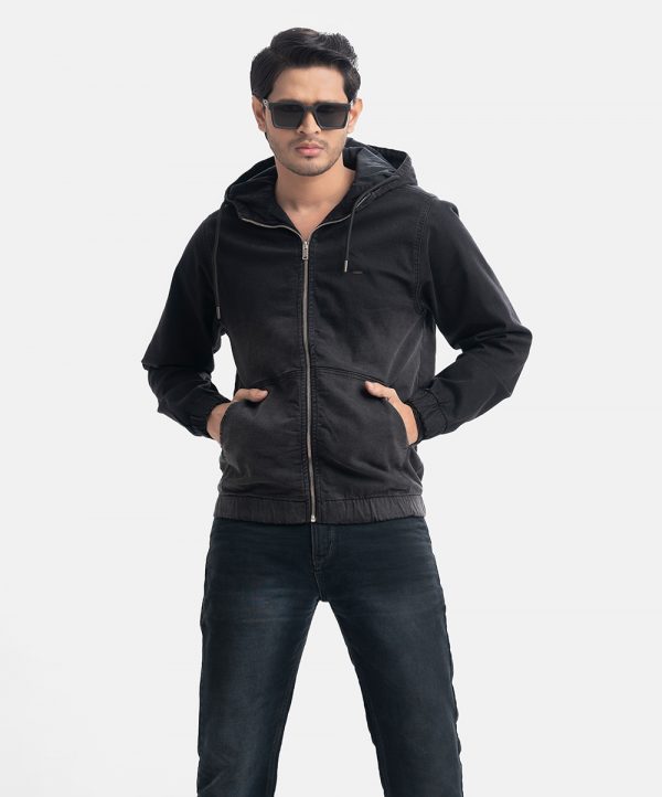Men’s casual hooded jacket in denim fabric. Full sleeves, front zipper opening with two hand-warming pockets.