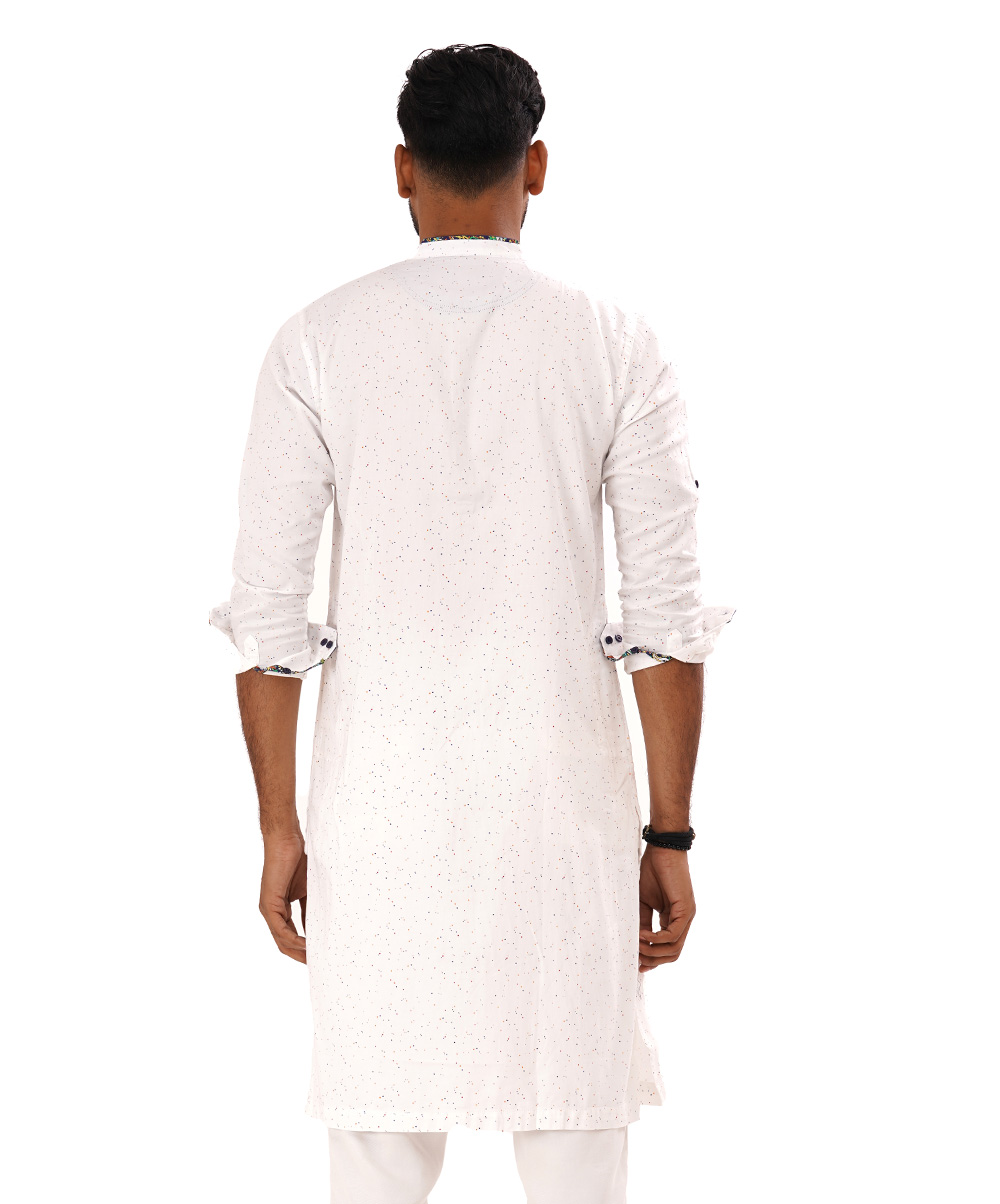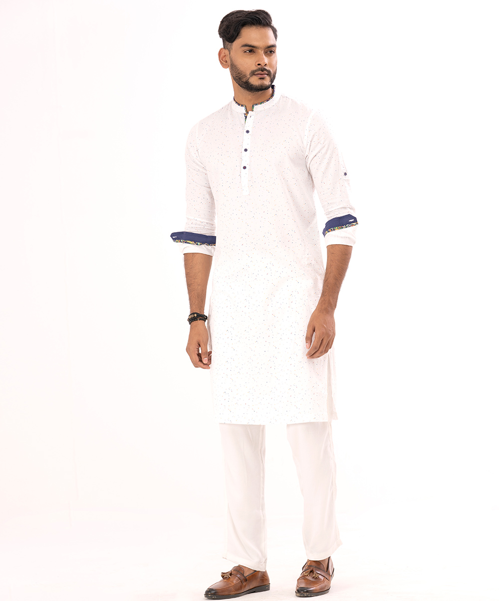 White semi fit panjabi in printed sateen cotton fabric. Embellished with contrast cut & sew on inner collar placket and sleeves opening.