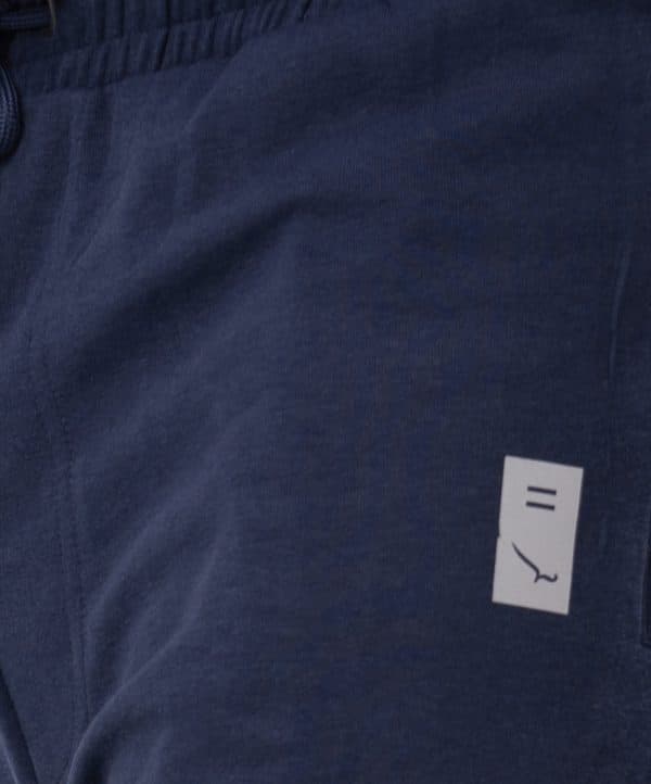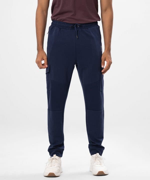 Navy Blue Trousers in interlock Cotton blend fabric. Designed with elasticized waistband with adjustable drawstring and side pockets with zipper. Leg pockets with flap.
