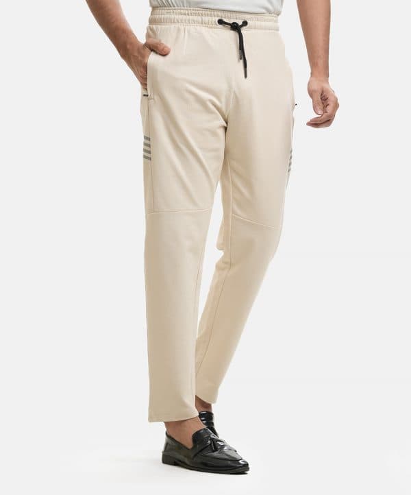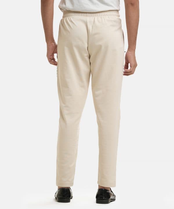 Men’s casual trouser in terry fabric. Concealed elasticated waistline with an adjustable drawstring and two zippered side pockets.