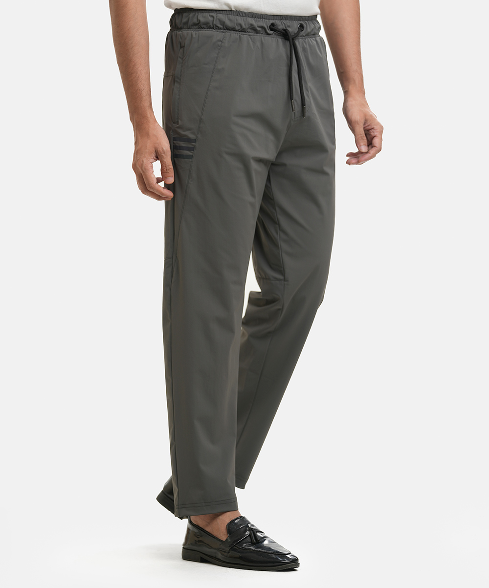Men’s casual trouser in nylon-blended fabric. Concealed elasticated waistline with an adjustable drawstring and two zippered side pockets.