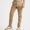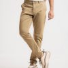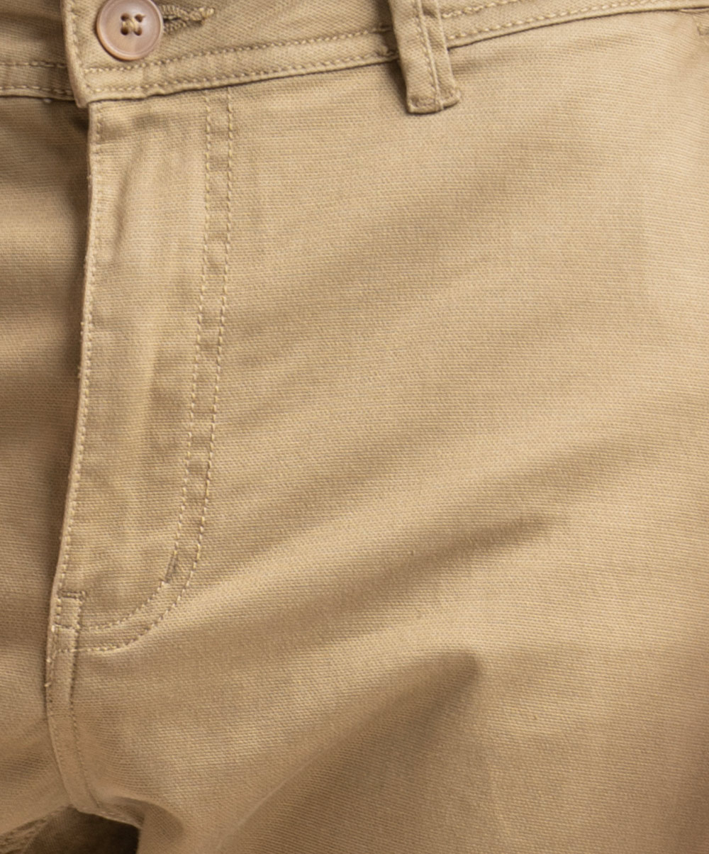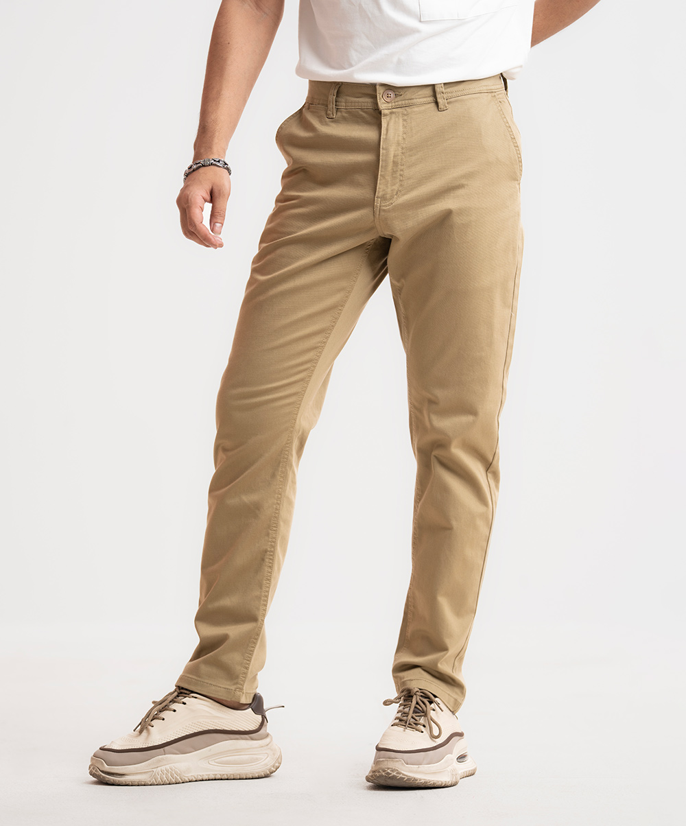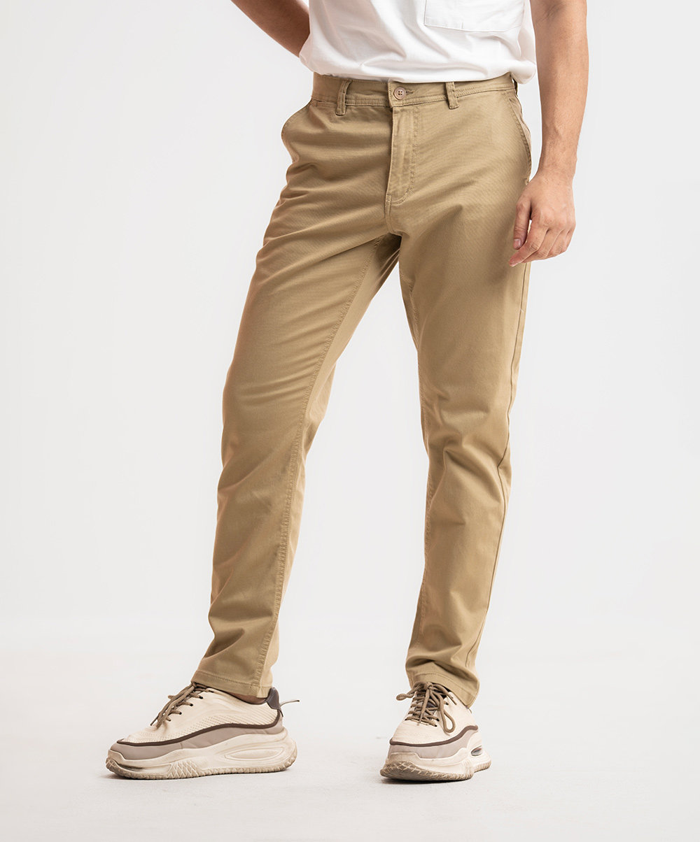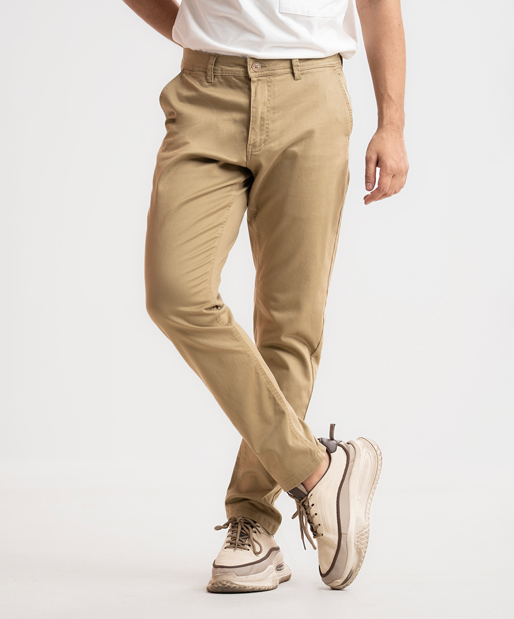 Men’s chinos in blended cotton fabric. Front zip fly with button, diagonal side pockets, and welt back pockets.