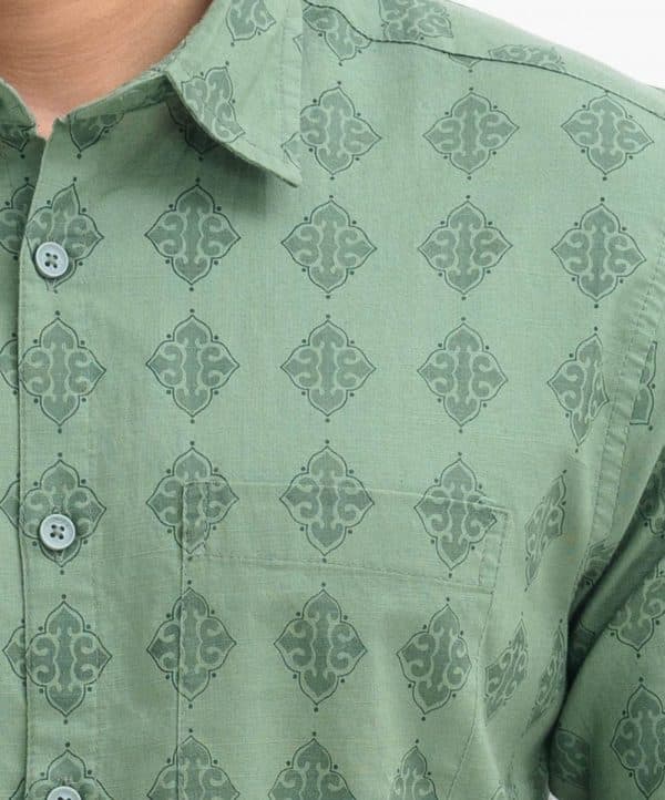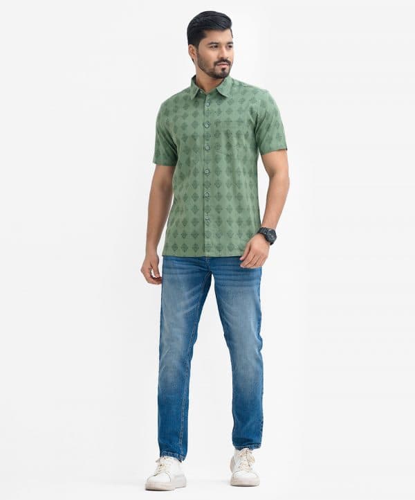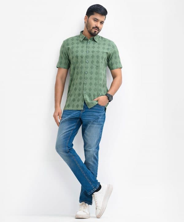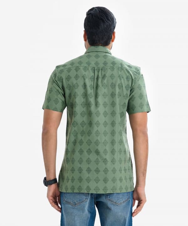 Men’s printed short-sleeved casual shirt in cotton fabric. Classic collar, button fastening at the front and a side pocket.