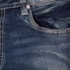Men’s bluish-grey denim pants in denim fabric. All over bluish-grey washed body, contrast stitch on pocket and waist sidelines, metal button, scratched fabric design on thigh, basic loop waist, and basic five pockets.
