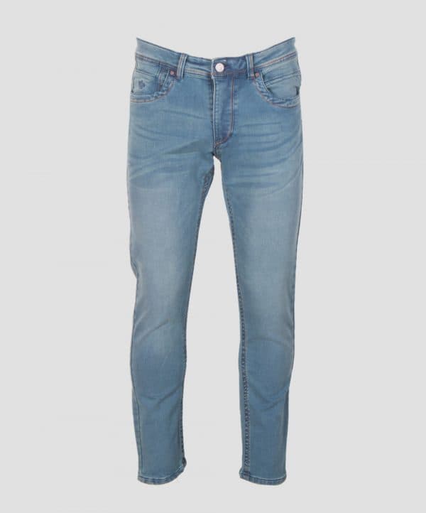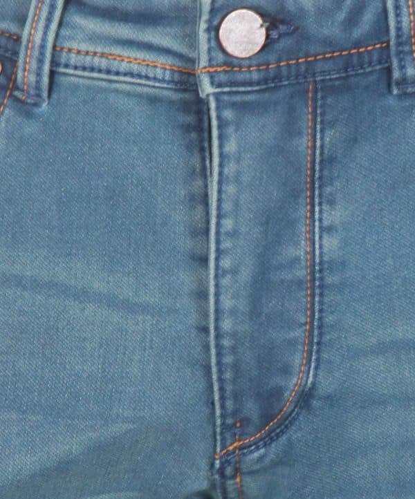 Men’s blue denim pants in denim fabric. All over solid blue washed body, contrast stitch on pocket and waist sidelines, metal button, adjustable elastic on waist, and basic five pockets.