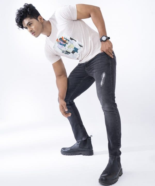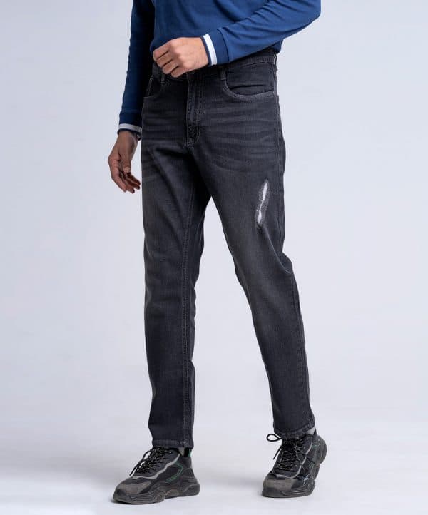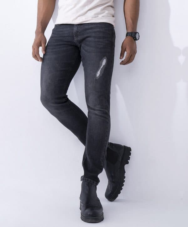 Slim fitted jeans in cotton spandex denim fabric. Five pockets, button fastening on the front and zipper fly.